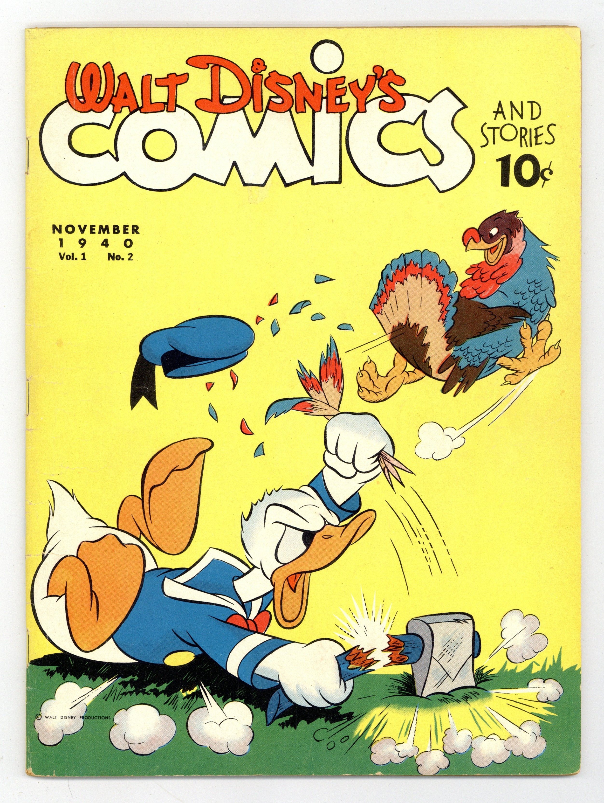 Stories and art by Floyd Gottfredson, Ted Thwaites, Bob Karp, Ted Osborne, and Al Taliaferro. Sometimes listed as Vol. 1, #2. The long-running vehicle for Disney character comics featured early work by Carl Barks, the legendary Good Duck Artist. In the conclusion of a classic Floyd Gottfredson story from the Mickey Mouse comic strip, Mickey and Goofy are captured along with Professor Einmug, while Pegleg Pete seeks the secrets of the floating island in the sky. But Einmug's booby traps will destroy the island – and the four of them with it! In another Gottfredson story, Mickey gets a pet ostrich, but that's waaaay more trouble than he expected. Donald and his nephews test out the saying, Don't put all your eggs in one basket. Plus a text story based on the classic Mickey cartoon The Little Whirlwind. Dizzy Business; Three Guesses; Back To Nature; Two Hits! One Error!; Oh, Nuts!; Donald Duck Goes A-Scouting; Daring Donald; A Slick Customer; Donald Fights Back; Campers Courageous; Try, Try, Again; Backfiring Inventions; Beating Around The Bush; And Now, the Donald Duck Doodle; The Little Whirlwind; Framed!; Donald Grows Wise; Fun at Home; The Flying Mouse; One Never Knows; Great Ideas, But...; Double Trouble; It's A Hard Life; Causes For Complaint; Thanksgiving Day; You Can't Win. 64 pages, Full Color. Cover price $0.10.