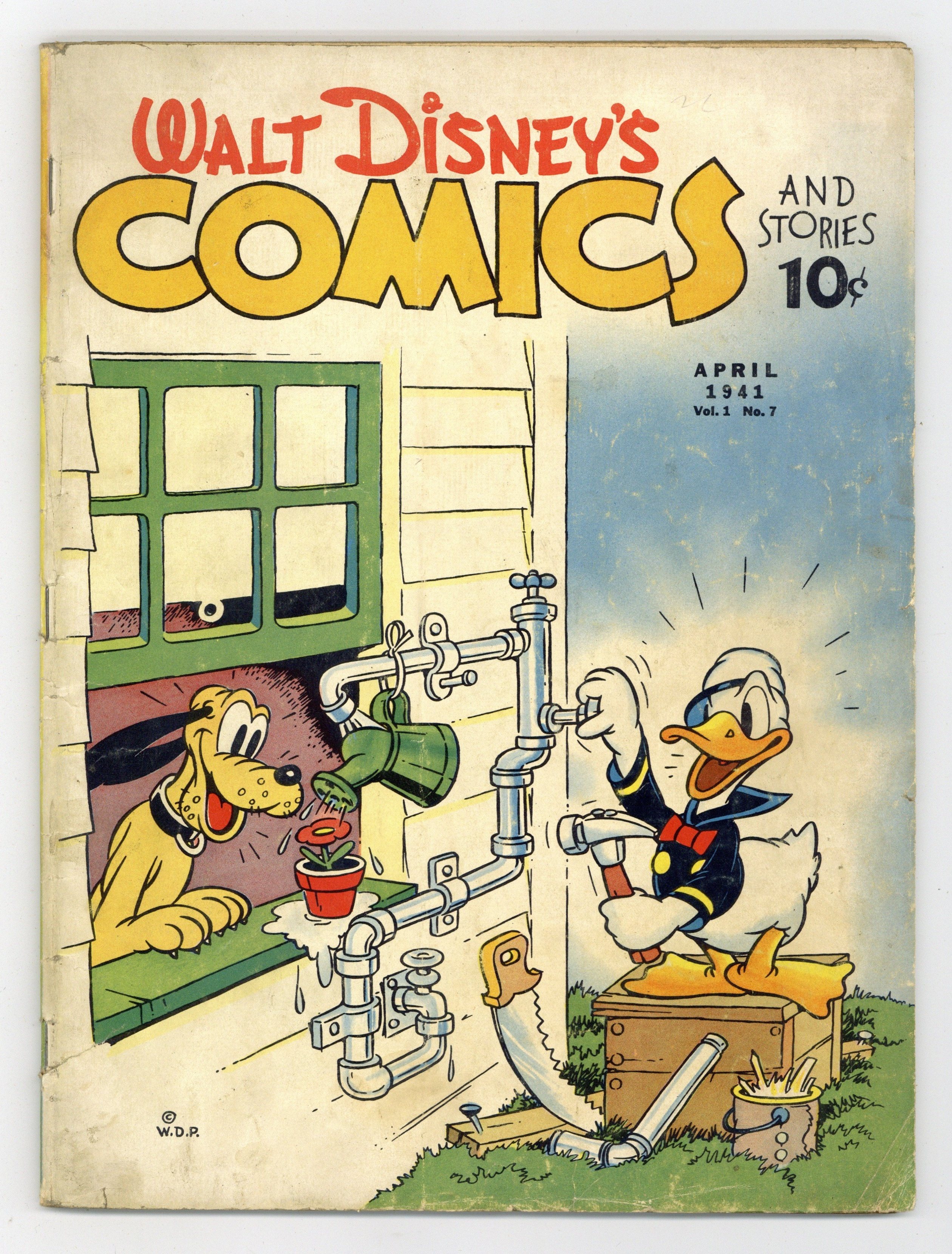 Stories and art by Floyd Gottfredson, Ted Thwaites, Ted Osborne, Merrill De Maris, Manuel Gonzales, Jimmy Berry, and Al Taliaferro. Sometimes listed as Vol. 1, #7. The long-running vehicle for Disney character comics featured early work by Carl Barks, the legendary Good Duck Artist. In a classic Floyd Gottfredson story from the Mickey Mouse comic strip, Mickey is asked to stand in for his lookalike, the irresponsible King of Medioka. In another Gottfredson story, Mickey is a secret agent seeking stolen plans. Donald hits everything but the nail. Ya Can't Make a Nickel!; He Fixed His Wag-End; Donald's Too Enthusiastic; Donald Had a Sinking Feeling; Just a Little Squirt; Donald Springs a New One; Movie Makers; Mickey Mouse in the Secret Service; Goofy Questions; It's a Crate Life; The Cat's Meow; False Alarm; Rub-A-Dub-Dub; Caught in the Act; Leaf It to Donald; Tie This One; Baggage Buster; A Good Time For a Dime; Food for Thought; He Saved It for a Rainy Day; He Gets It Coming and Going; The Kibitzer; The Nifty Nineties; His Royal Highness. 64 pages, Full Color. Cover price $0.10.