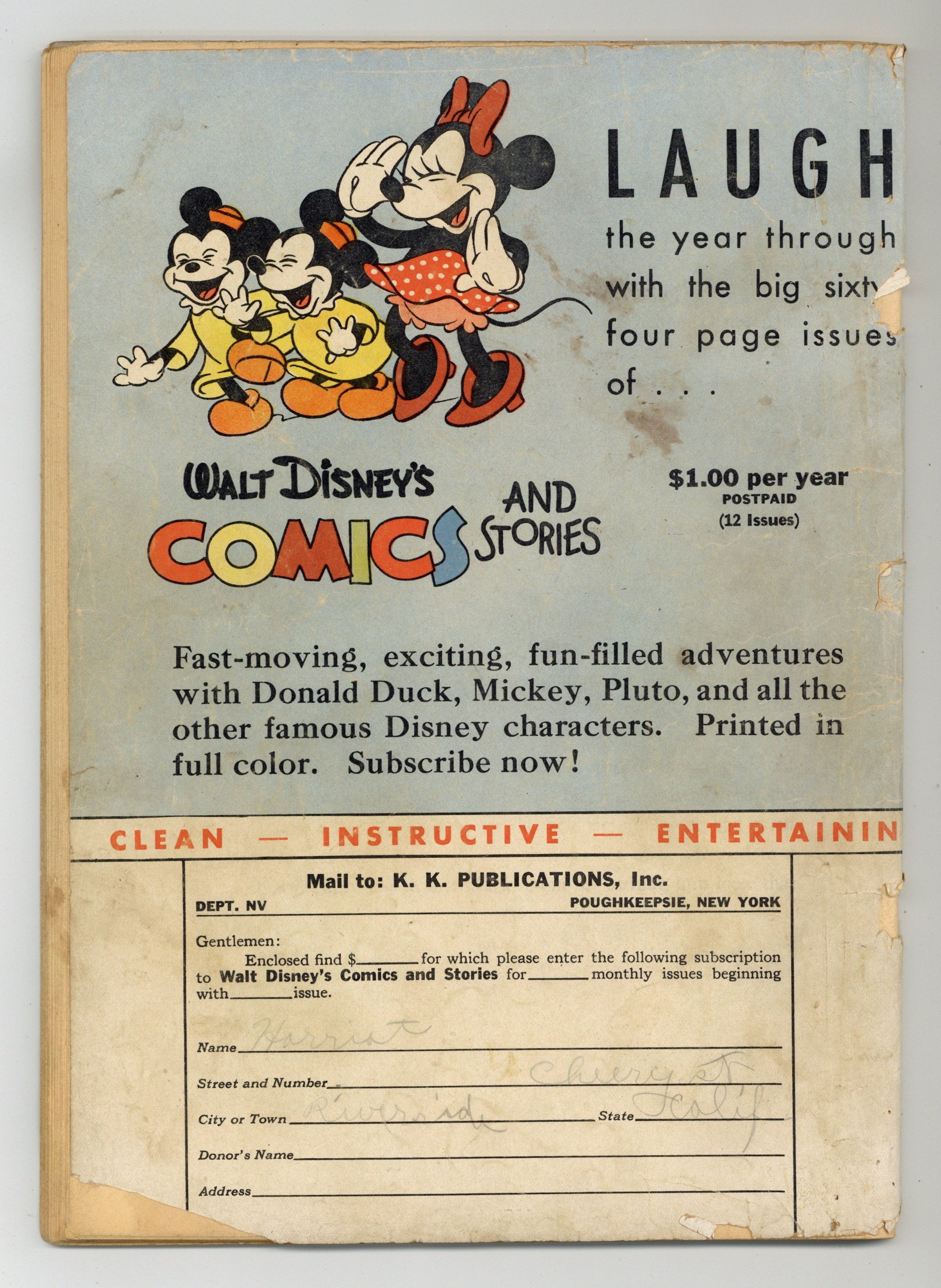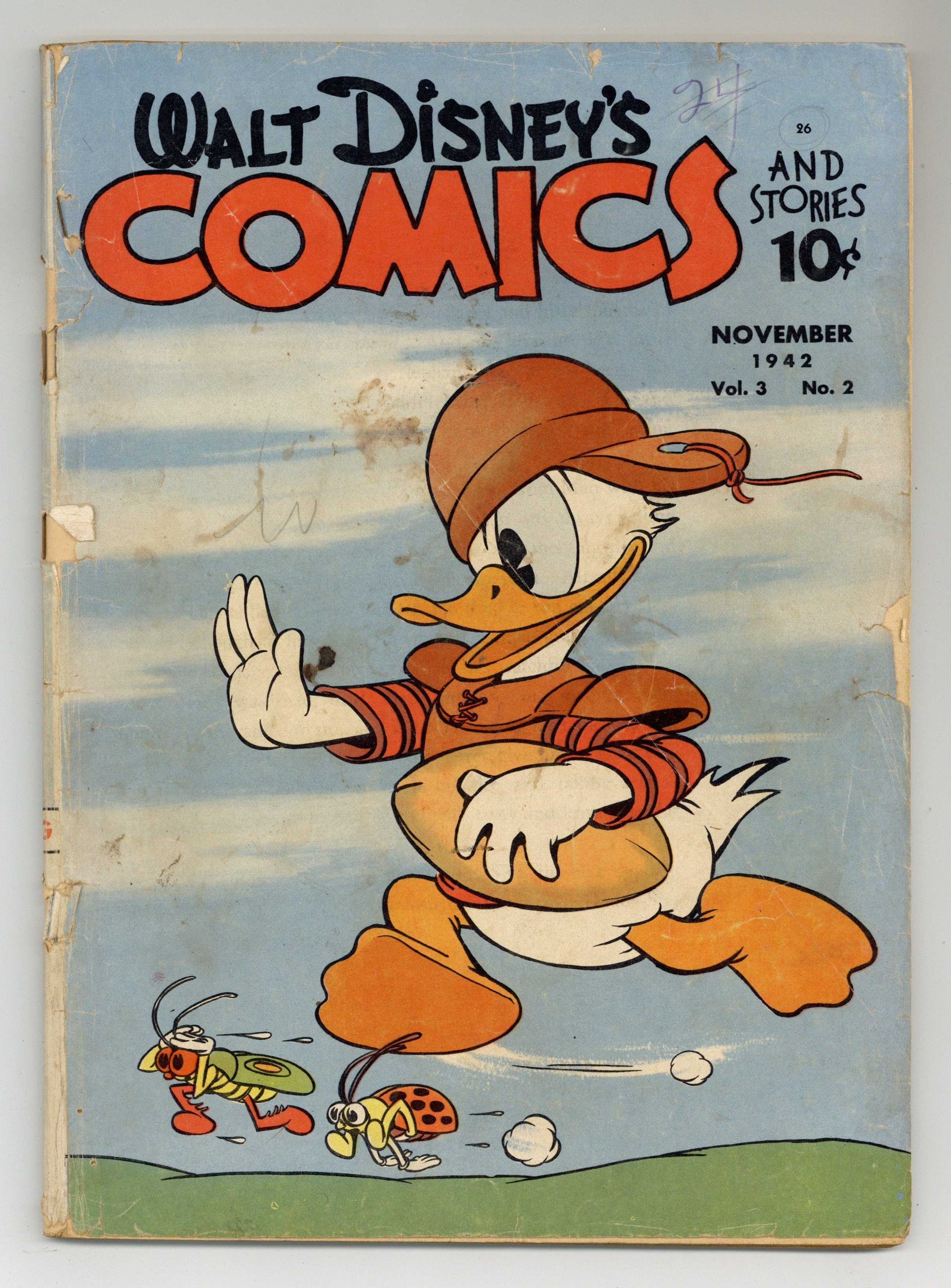 Tags: Disney Ducks & MicePublished Nov 1942 by Dell/Gold Key.$125.00- 3" cumulative spine split. Staple added (not manufacturing). Cover detached at two staples. Water spotting. Chipping.