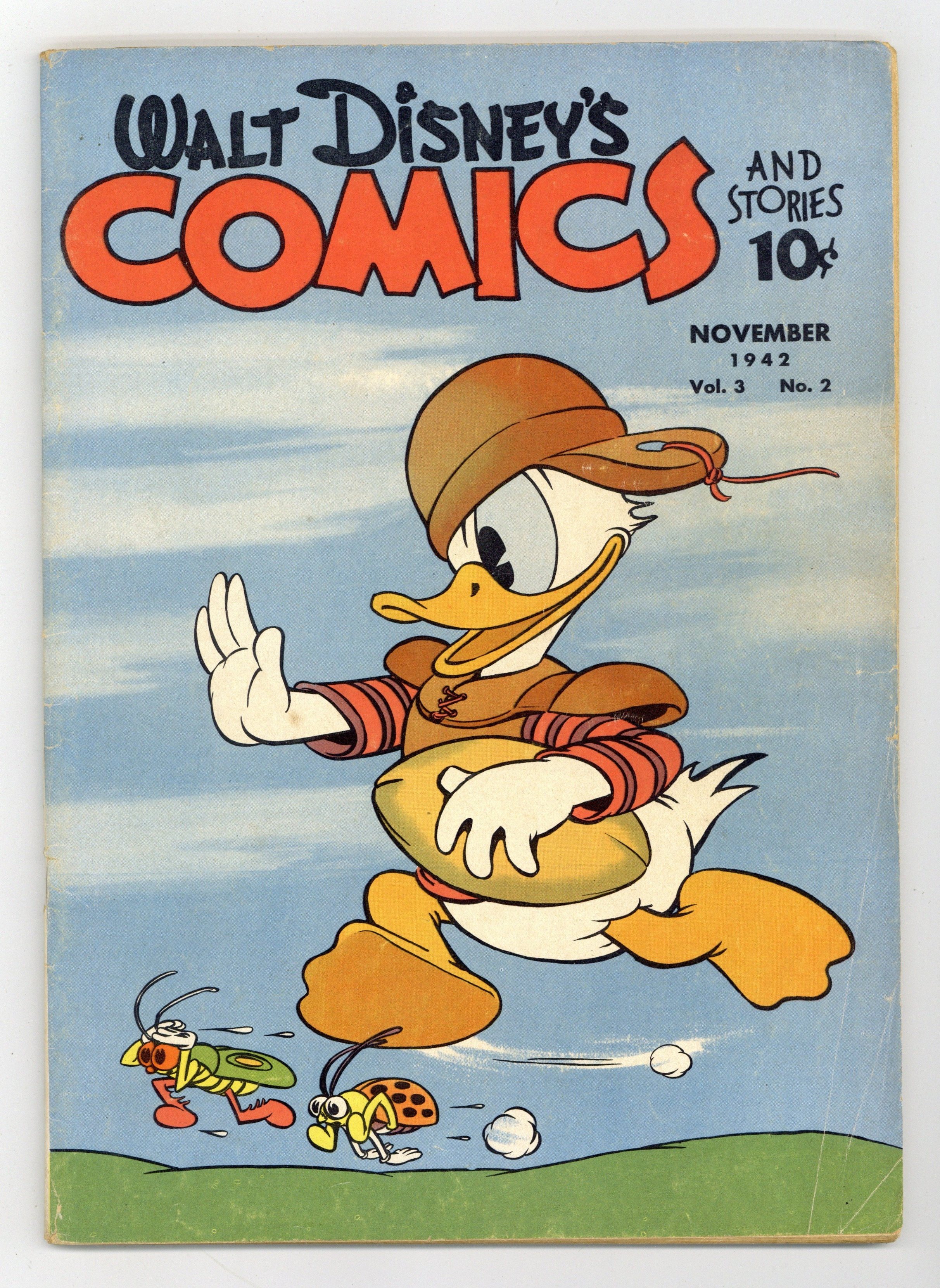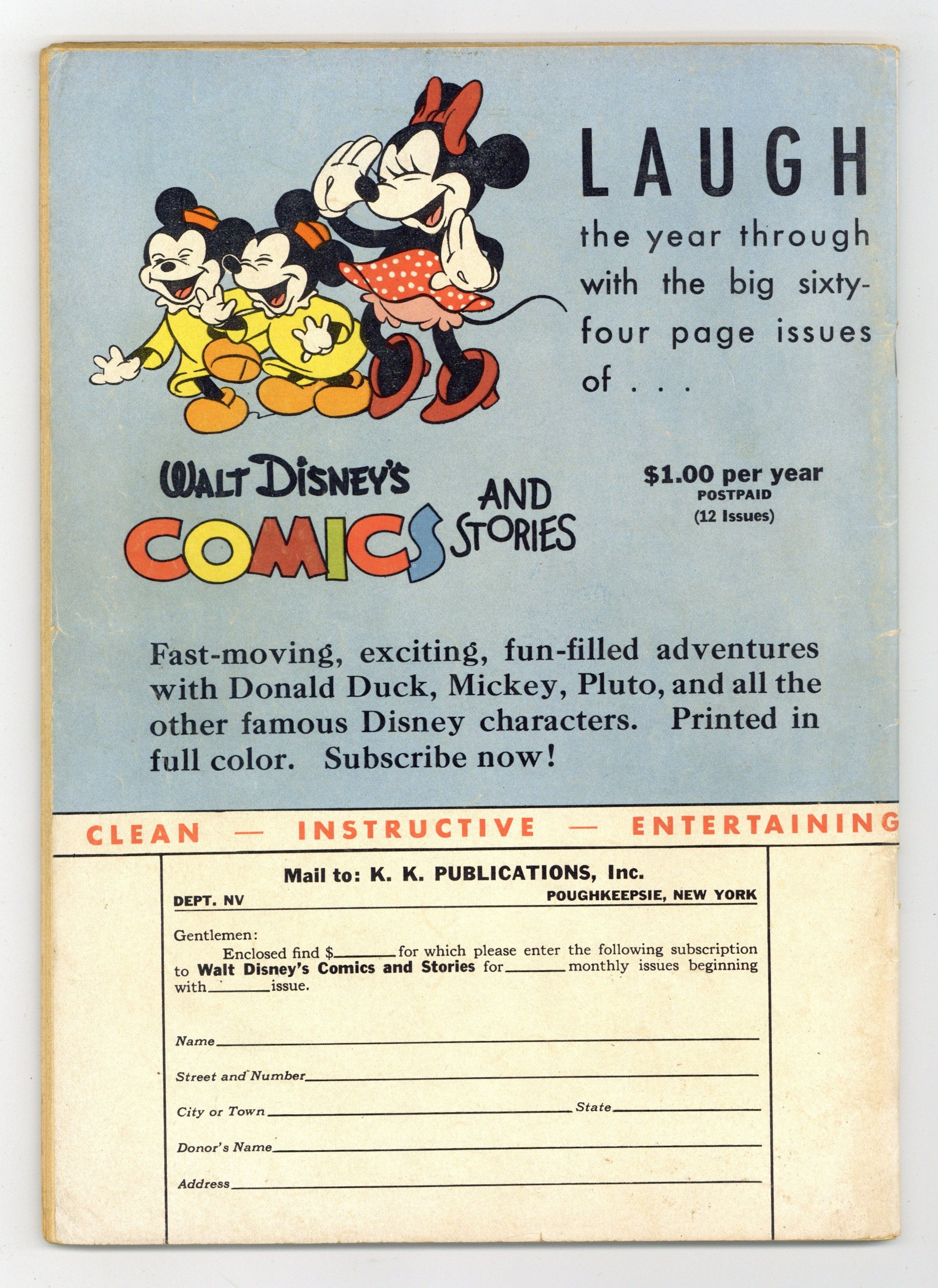 Cover by Carl Buettner. Stories and art by Floyd Gottfredson, Ted Osborne, Ted Thwaites, Merrill De Maris, Bob Karp, Manuel Gonzales, Bob Wright, Bob Grant, and Al Taliaferro. Sometimes listed as Vol. 3 #2. The long-running vehicle for Disney character comics. In a classic Floyd Gottfredson story from the Mickey Mouse comic strip, Mickey discovers that a mysterious force field prevents planes from flying over a hidden valley. Bucky Bug sails into Mother Goose Land and encounters characters from nursery rhymes. In one of several stories reflecting America's entry into WWII, Donald Duck can't listen to the radio because of air-defense broadcasts. A Bedtime Story; Bringing Home the Bacon; Dead End Kidder; The Heat's on; Donald's Tire Troubles; A Horse of a Different Color; Expensive Economy; Dead Letter Office; Poor Reception; The Vanishing Magician; Mickey Mouse at the Bar None Ranch; Hollywood Chatter; Farmers' Problems; Foiled Again!; Great Expectations; No Half-Way Measures; Overloaded; How to Be a Sailor; Mickey Mouse Movies; Boys Will Be - Girls!; The Wrong Combination. 64 pages, Full Color. Cover price $0.10.