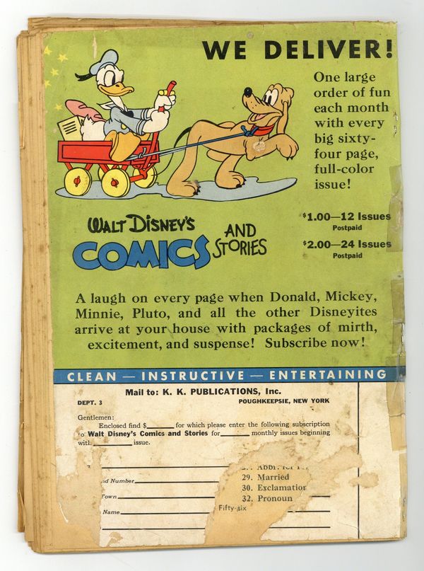 Tags: Disney Ducks & MicePublished Mar 1943 by Dell/Gold Key.$175.00- 1" Spine split from bottom. Cover and centerfold detached. Pencil writing on interior page.