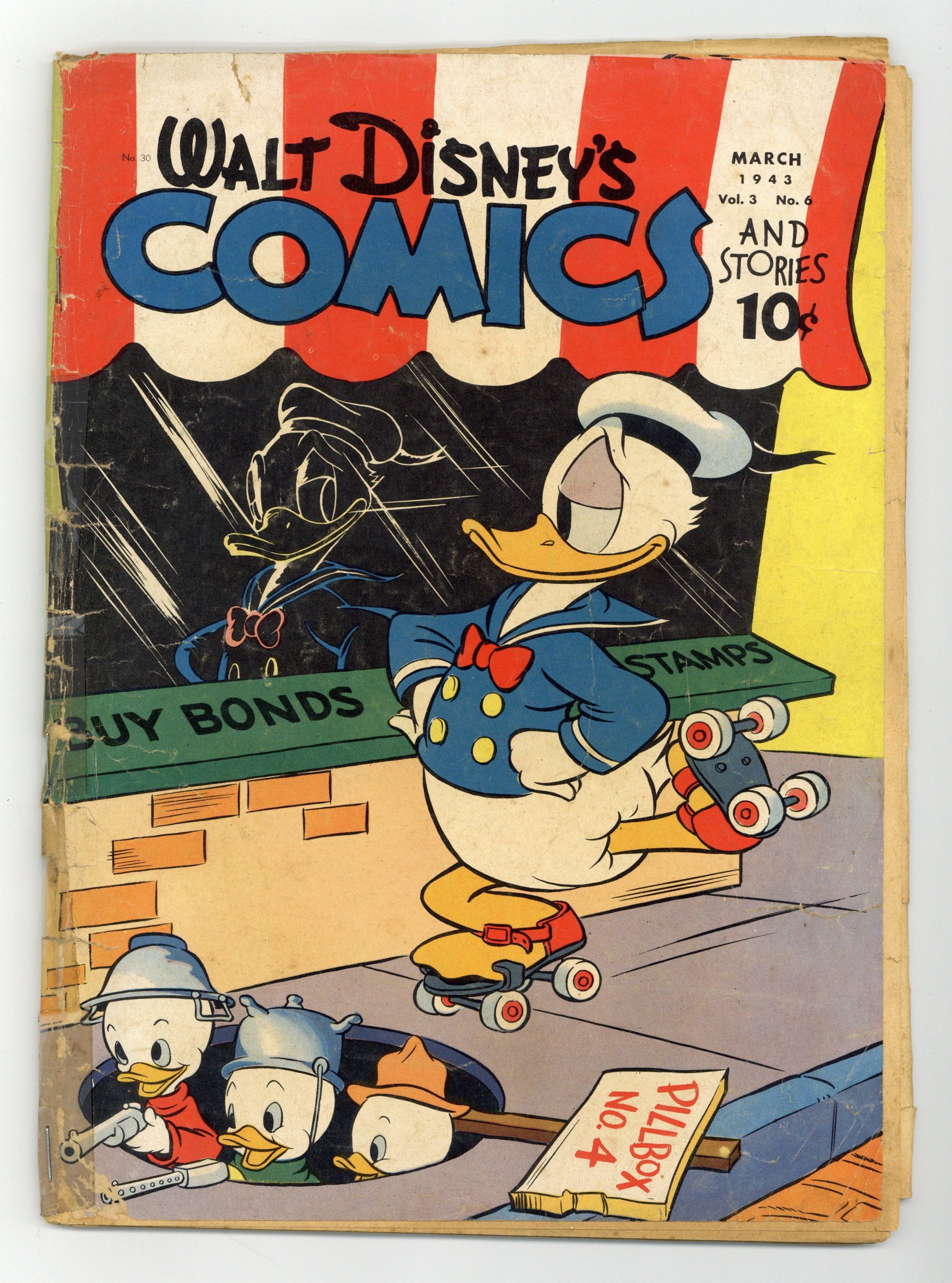 Tags: Disney Ducks & MicePublished Mar 1943 by Dell/Gold Key.$155.00- Near full length spine split. Centerfold detached. Staples added (not manufacturing).