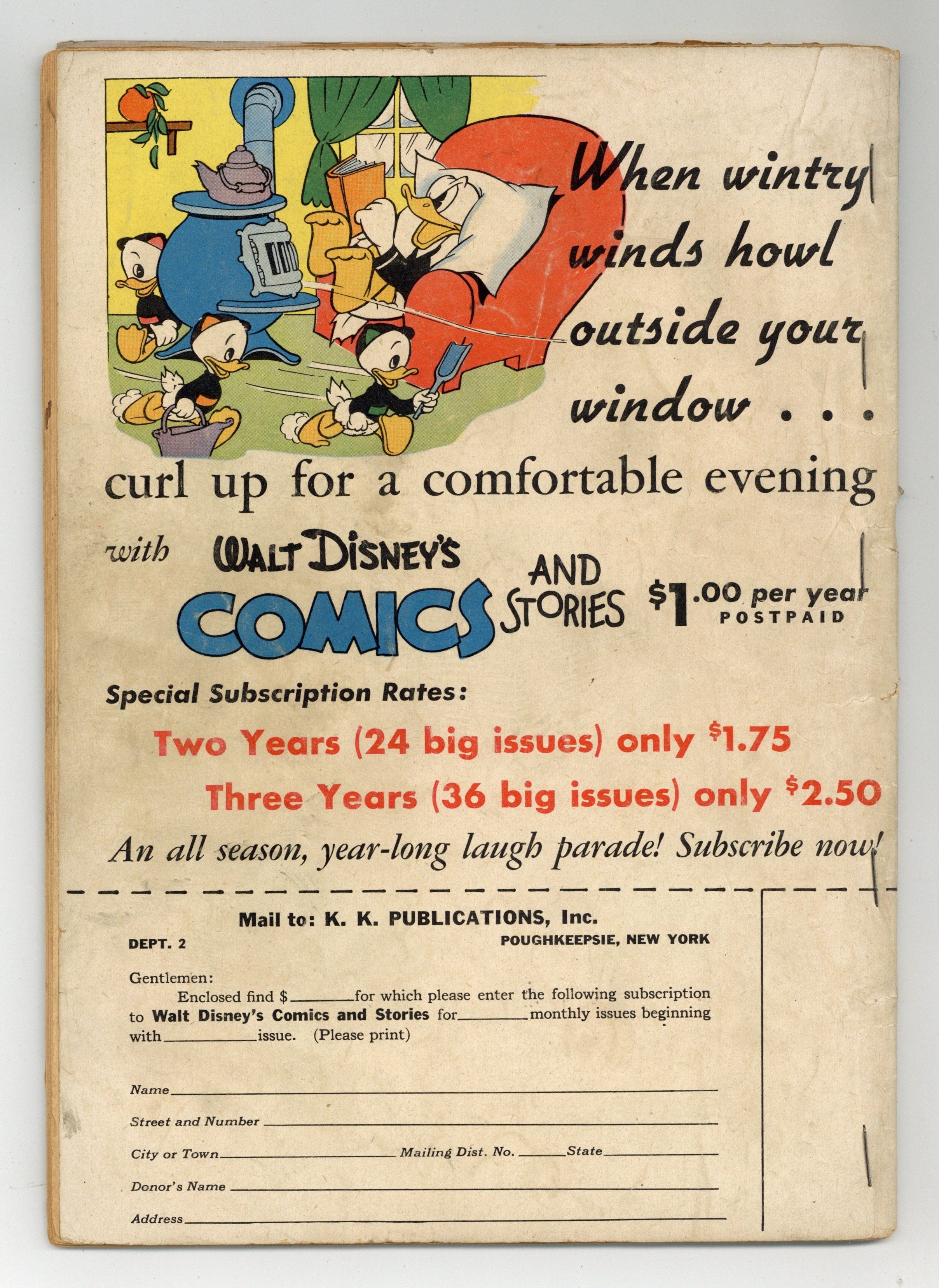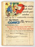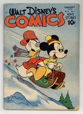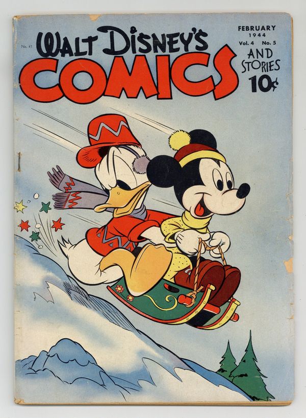 Cover by Walt Kelly. Stories and art by Walt Kelly, Carl Barks, Floyd Gottfredson, Merrill De Maris, Bob Karp, Carl Buettner, George Waiss, Manuel Gonzales, Sylvia Holland, Bill Wright, and Al Taliaferro. Sometimes listed as Vol. 4 #5. The long-running vehicle for Disney character comics featured work by Carl Barks, Floyd Gottfredson, and Pogo's Walt Kelly. In a classic Floyd Gottfredson story from the Mickey Mouse comic strip, Professor Dustibones enlists Mickey for a journey to a land of prehistoric creatures. In a story by Barks, Donald builds a suit of armor to attack his nephews' snow fort, and the combat just escalates from there. In a story by Kelly, Gremlin Gus makes mischief in the kitchen. Plus the Hollywood Chatter column discusses the fifteenth anniversary of the first Mickey Mouse cartoon. The Duck in the Iron Pants; Bucky Bug; Clearer Visibility; Tokens for Tokyo; 'Sno Use; Handwriting in the Snow; Slim Pickin's; Gremlin Gus; Mickey Mouse: In the Land of Long Ago; Hollywood Chatter; Gilt-Edged Security; Stuffy's Picnic; Table Manners; Mush, Boy, Mush!; A Difficulty Ironed Out; Aerial Combat; Sink or Swim; Let's Make Valentines; Hey, Rube!; Winter Sports; The Invisible Man; It's a Gift; Getting Down to Earth; Horse Sense; All Snow and a Yard Wide; School's Out; Patriot Satisfies Wanderlust; Insomnia 'Nipped' in the Bud; Pass The Ammunition; Fair and Warmer. 56 pages, Full Color. Cover price $0.10.