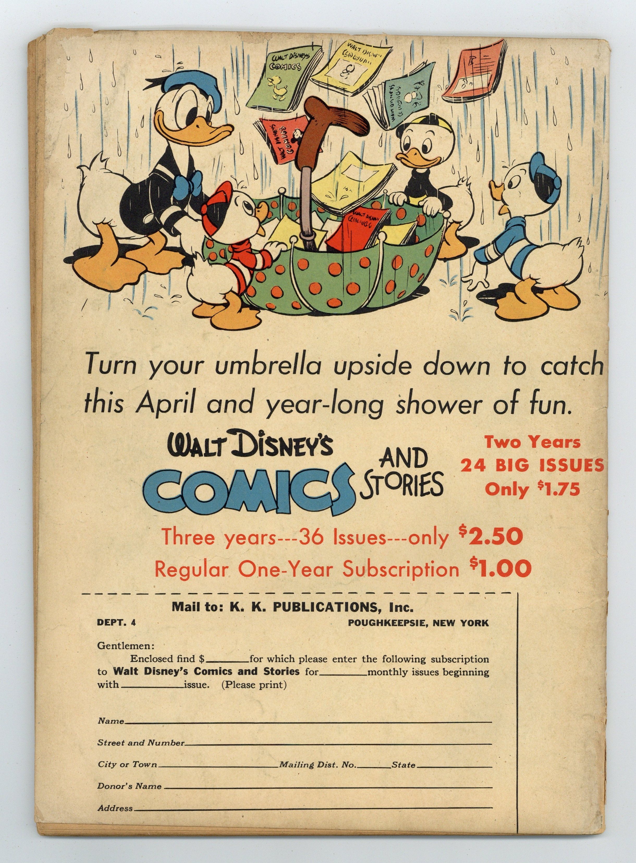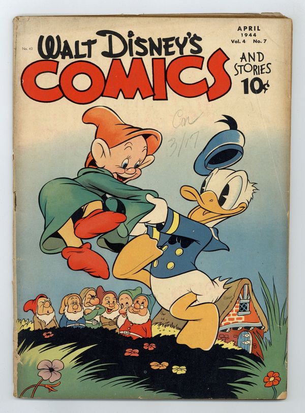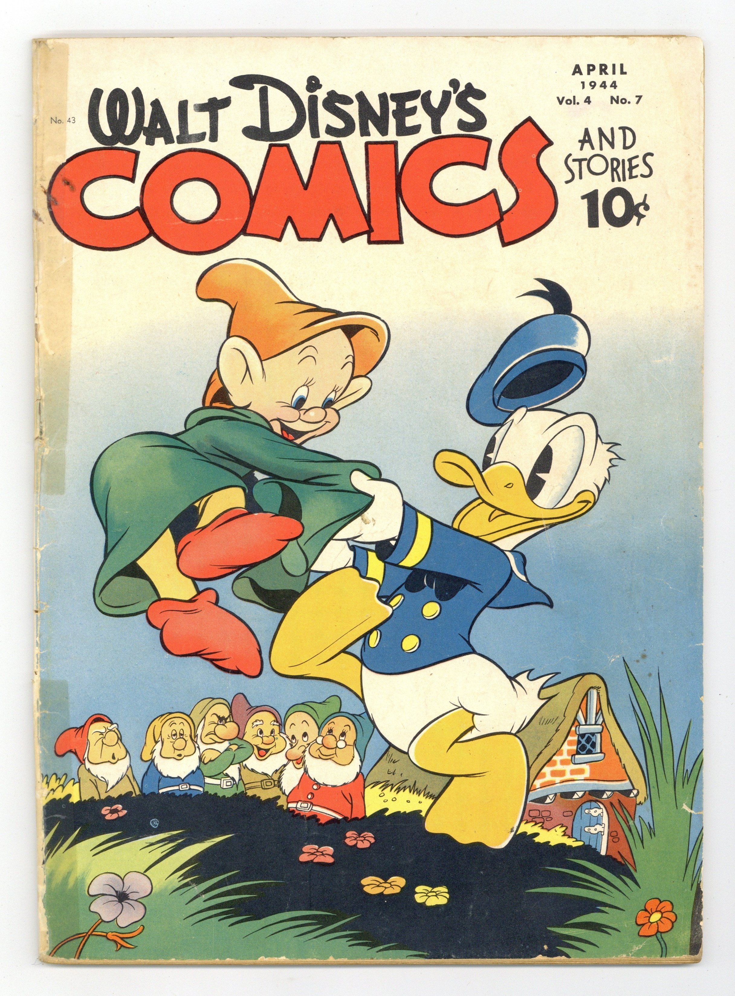 Cover by Walt Kelly. Stories and art by Walt Kelly, Carl Barks, Floyd Gottfredson, Merrill De Maris, Bob Karp, Hubie Karp, Carl Buettner, George Waiss, Veve Risto, Roger Armstrong, Manuel Gonzales, Sylvia Holland, Bill Wright, and Al Taliaferro. Sometimes listed as Vol. 4 #7. The long-running vehicle for Disney character comics featured work by Carl Barks, Floyd Gottfredson, and Pogo's Walt Kelly. In a classic Floyd Gottfredson story from the Mickey Mouse comic strip, Professor Dustibones enlists Mickey for a journey to a land of prehistoric creatures. In a story by Barks, Huey, Dewey and Louie vow never to take a bath again, leading to a war with Donald to get them in the tub. In a story by Kelly, Donald Duck meets the Seven Dwarfs. Three Dirty Little Ducks; Bucky Bug; Mickey Mouse; The Treasure Hunt; Heel Make Money!; Its a Wonderful Institution!; Whats in a Name?; Timber!!; A Damp Argument; Donald Duck and the Seven Dwarfs; Mickey Mouse: In the Land of Long Ago; Accommodating!; A Thirst Quencher; In a Jam. 48 pages, Full Color. Cover price $0.10.