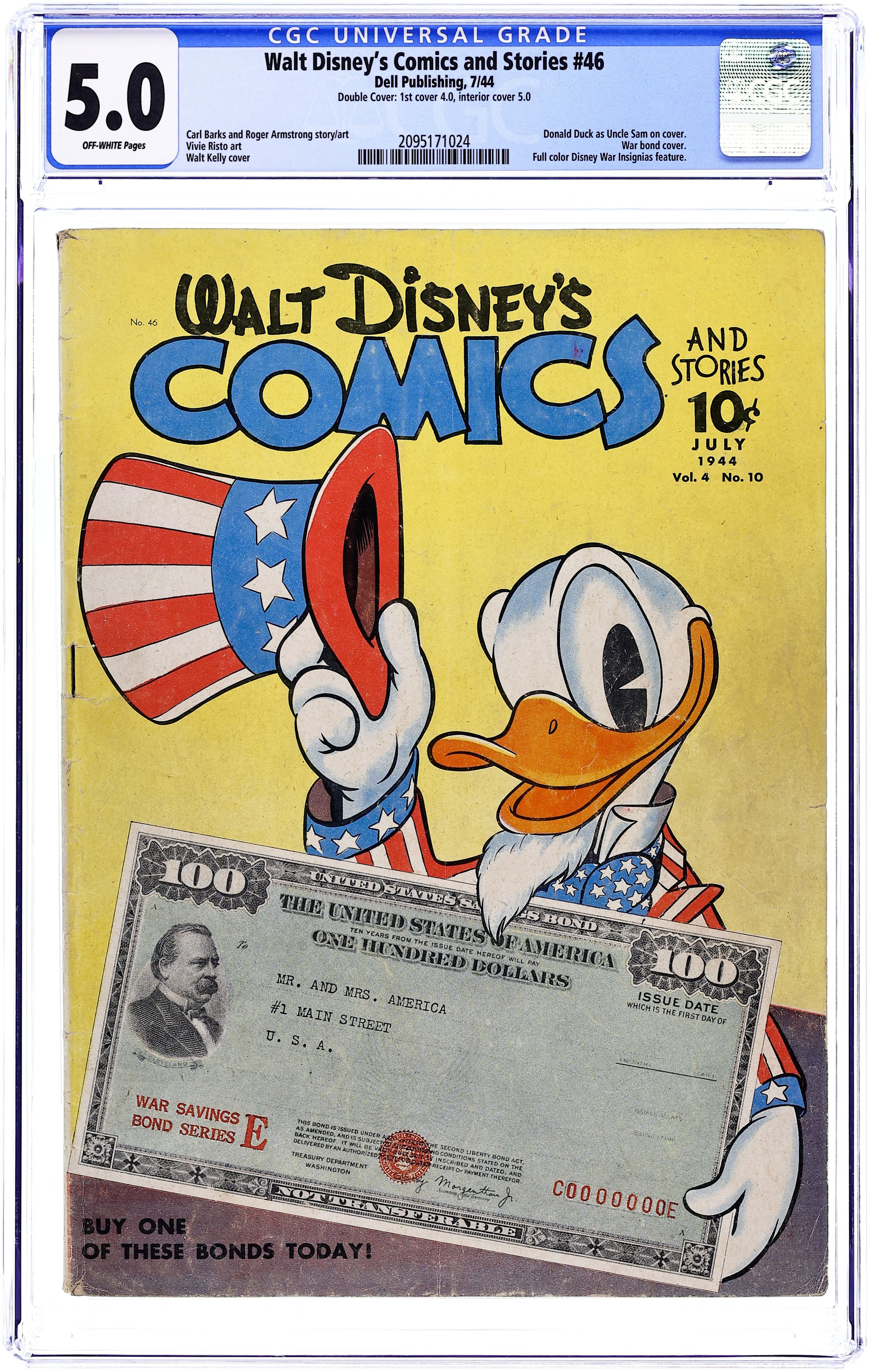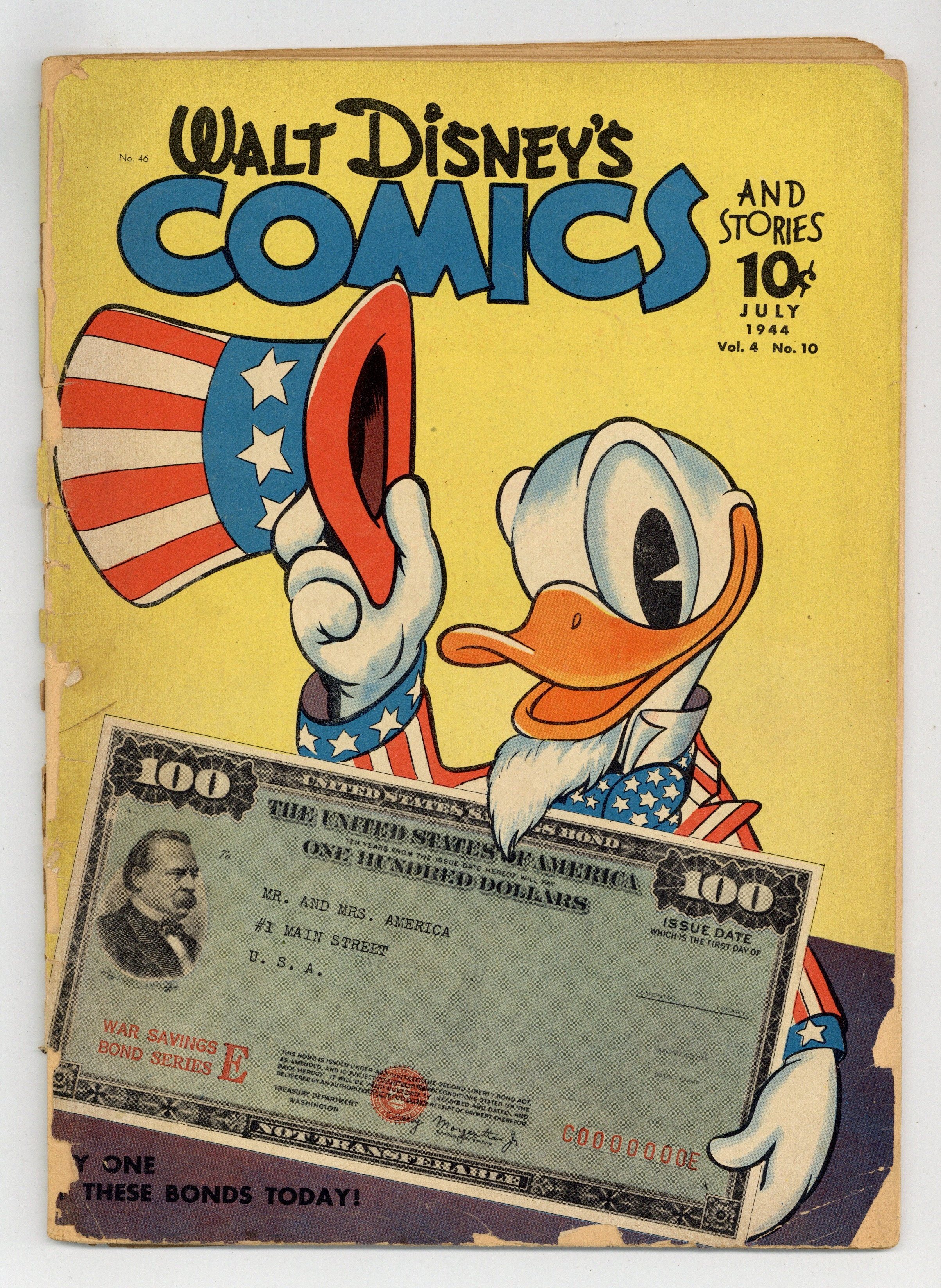 Cover by Walt Kelly. Stories and art by Carl Barks, Floyd Gottfredson, Dick Moores, Merrill De Maris, Bob Karp, Carl Buettner, George Waiss, Veve Risto, Roger Armstrong, Manuel Gonzales, Sylvia Holland, Bill Wright, and Al Taliaferro. Sometimes listed as Vol. 4 #10. The long-running vehicle for Disney character comics featured work by Carl Barks, Floyd Gottfredson, and Pogo's Walt Kelly. In a classic Floyd Gottfredson story from the Mickey Mouse comic strip, Mickey becomes the pilot of the experimental plane and finds himself over Nazi-held France. In a story by Barks, Donald competes with his nephews for news photos to sell to the local newspaper. In another story, Donald gets a mail-order penguin. Cover by Walt Kelly doubles as a PSA and features Donald Duck dressed as Uncle Sam, holding a WWII-era War Bond. Camera Crazy; Bucky Bug; Tiger Trouble; Mickey Mouse; Super Satisfaction; Here Comes the Iceman; Modern Design; A Car on the Time Plan; Shear the Wool!; Putt Out; Mickey Mouse: On a Secret Mission; Remote Control; Cold Treatment; Fowl Play; Labor Savers; Coals to Newcastle; Ducking Two Ducks Is No Duck Soup! 48 pages, Full Color. Cover price $0.10.