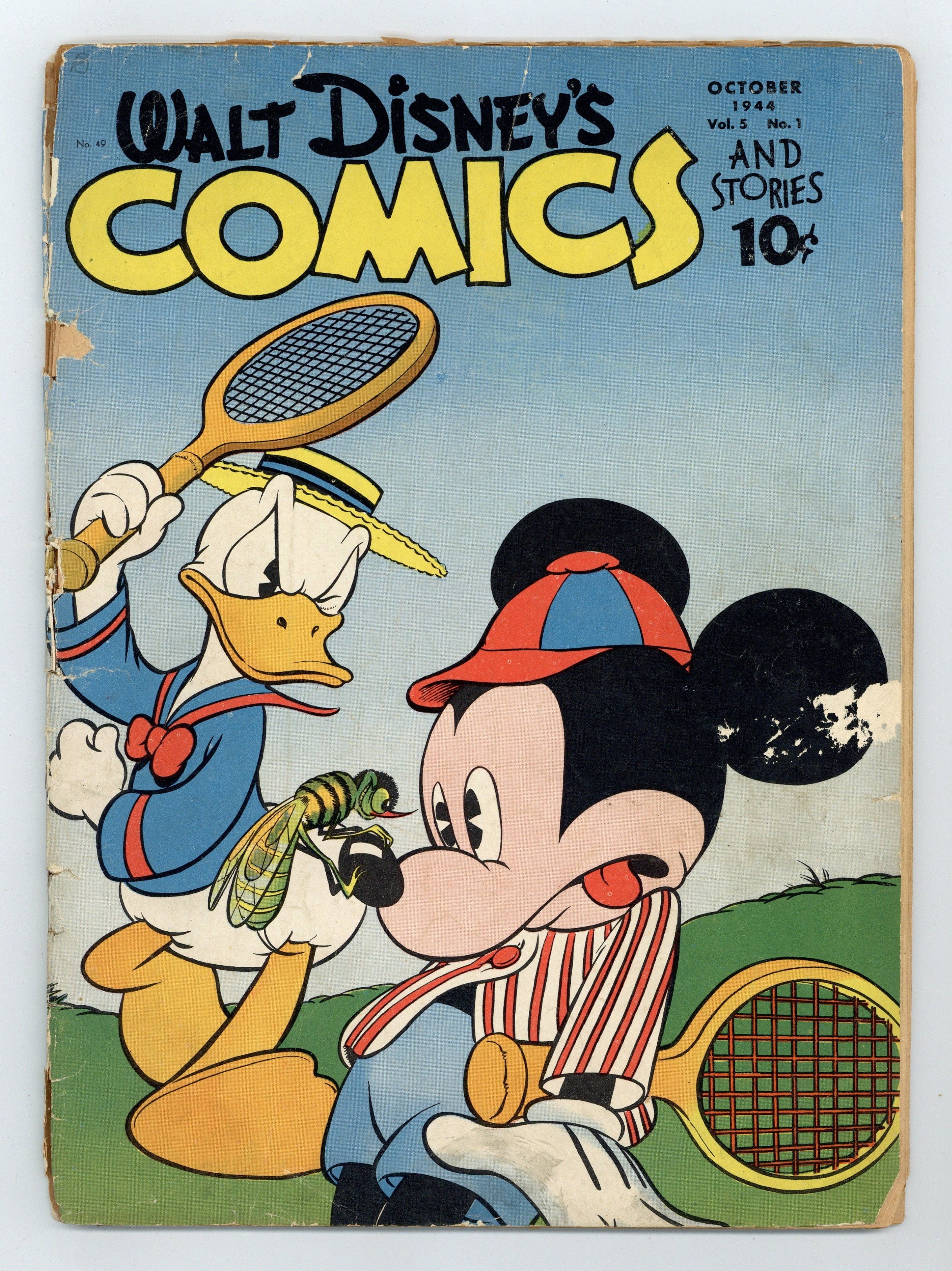 Cover by Walt Kelly. Stories and art by Carl Barks, Floyd Gottfredson, Dick Moores, Bill Walsh, Bob Karp, Hubie Karp, Carl Buettner, George Waiss, Veve Risto, Manuel Gonzales, Sylvia Holland, Bill Wright, and Al Taliaferro. Sometimes listed as Vol. 5 #1. The long-running vehicle for Disney character comics featured work by Carl Barks, Floyd Gottfredson, and Pogo's Walt Kelly. In a classic Floyd Gottfredson story from the Mickey Mouse comic strip, Mickey helps refugee children escape WWII. In a story by Barks, Donald becomes a tightrope walker and decides to cross Niagara Falls on a wire. Dumbo the elephant helps the Seven Dwarfs when they encounter a Giant. Donald Duck; Bucky Bug; The Seven Dwarfs and Dumbo; Mickey Mouse; Joe's Gems; Convertible Contraption for Cans OR Cultivating!; Slight Reduction; Up a Tree; Poor Fish; High But Not Dry; Mickey Mouse and the War Orphans. 48 pages, Full Color. Cover price $0.10.