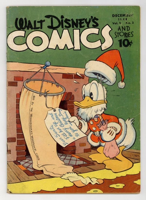 Cover by Walt Kelly. Stories and art by Carl Barks, Floyd Gottfredson, Dick Moores, Bill Walsh, Bob Karp, Hubie Karp, Carl Buettner, George Waiss, Manuel Gonzales, Sylvia Holland, Bill Wright, and Al Taliaferro. Sometimes listed as Vol. 5 #3. The long-running vehicle for Disney character comics featured work by Carl Barks, Floyd Gottfredson, and Pogo's Walt Kelly. In a classic Floyd Gottfredson story from the Mickey Mouse comic strip, Mickey uses mysterious machinery to build a box with strange powers over time and space. In a story by Barks, Donald's new "seaside home" turns out to be a beach shack plagued by sandstorms and giant turtles. June is kidnapped by crooks, and Bucky Bug must find her. Donald Duck; Bucky Bug; Mickey Mouse; Tillie Tiger; Goofy's Turkey; Mickey Mouse and the 'Lectro Box. 48 pages, Full Color. Cover price $0.10.