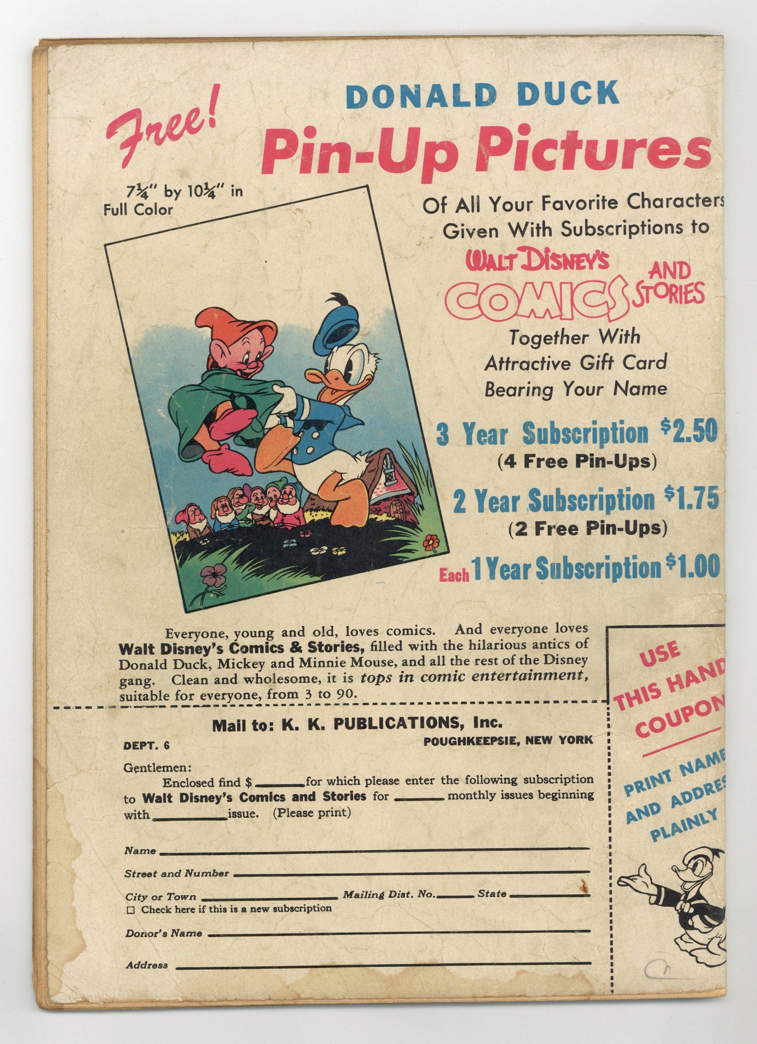 Tags: Disney Ducks & MicePublished Jun 1946 by Dell/Gold Key.$85.00- Interior tearing, slightly affects panel edge and art. Cover and centerfold detached at one staple. Water damage. Cover oxidation.