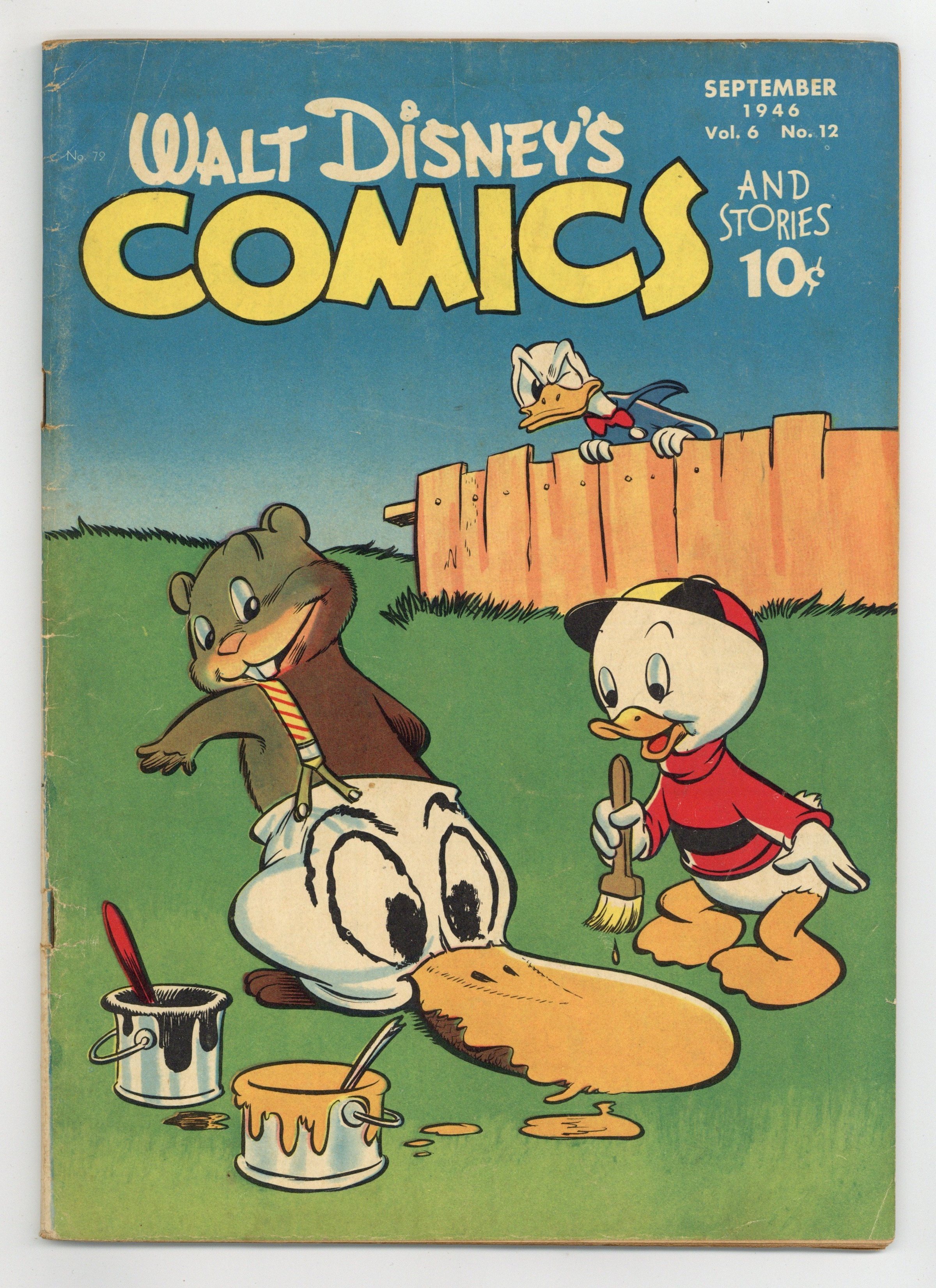 Cover by Walt Kelly. Stories and art by Carl Barks, Floyd Gottfredson, Bill Walsh, Bob Karp, Karl Karpé, Hubie Karp, Carl Buettner, George Waiss, Manuel Gonzales, Don Gunn, Bill Wright, Sylvia Holland, and Al Taliaferro. Sometimes listed as Vol. 6 #12. The long-running vehicle for Disney character comics featured work by Carl Barks, Floyd Gottfredson, and Pogo's Walt Kelly. In a classic story from the Mickey Mouse comic strip, Mickey inherits a haunted house from his Uncle Max. In a story by Barks, Donald goes after his nephews after they skip school and catch a freight train for Pickleburg. Frontiersman Donald abducts a bear cub, but mama's not going to be happy about that. Donald Duck; Bucky Bug; Li'l Bad Wolf; Mickey Mouse; Circus Fun; High Tide; Dumbbell of the Yukon; Mickey Mouse: The House of Mystery. 48 pages, Full Color. Cover price $0.10.
