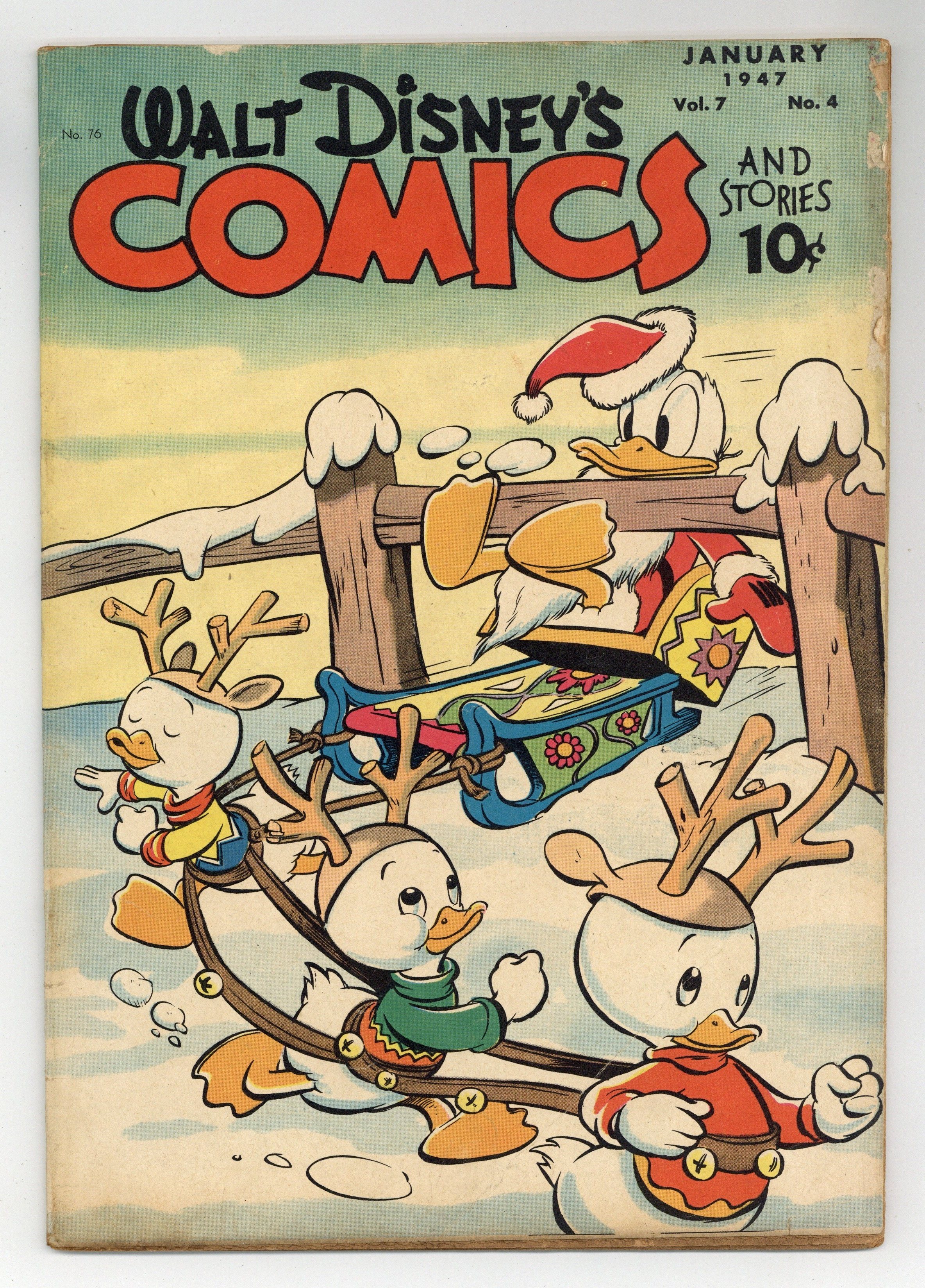 Cover by Walt Kelly. Stories and art by Carl Barks, Floyd Gottfredson, Bill Walsh, Bob Karp, Hubie Karp, Roger Armstrong, George Waiss, Bill Wright, Sylvia Holland, and Al Taliaferro. Sometimes listed as Vol. 7 #4. The long-running vehicle for Disney character comics featured work by Carl Barks, Floyd Gottfredson, and Pogo's Walt Kelly. In a story by Barks, Donald takes in a stray cat that keeps his nephews awake all night. A burglar tries to rob Mickey Mouse on Christmas Eve, and instead winds up getting involved in trying to put Mickey's train set together. Donald Duck; Bucky Bug; Li'l Bad Wolf; Mickey Mouse; Twas the Night Before Christmas; Br'er Rabbit; The Night Before Christmas; Straight Shooters; Mickey Mouse: The House of Mystery. 48 pages, Full Color. Cover price $0.10.