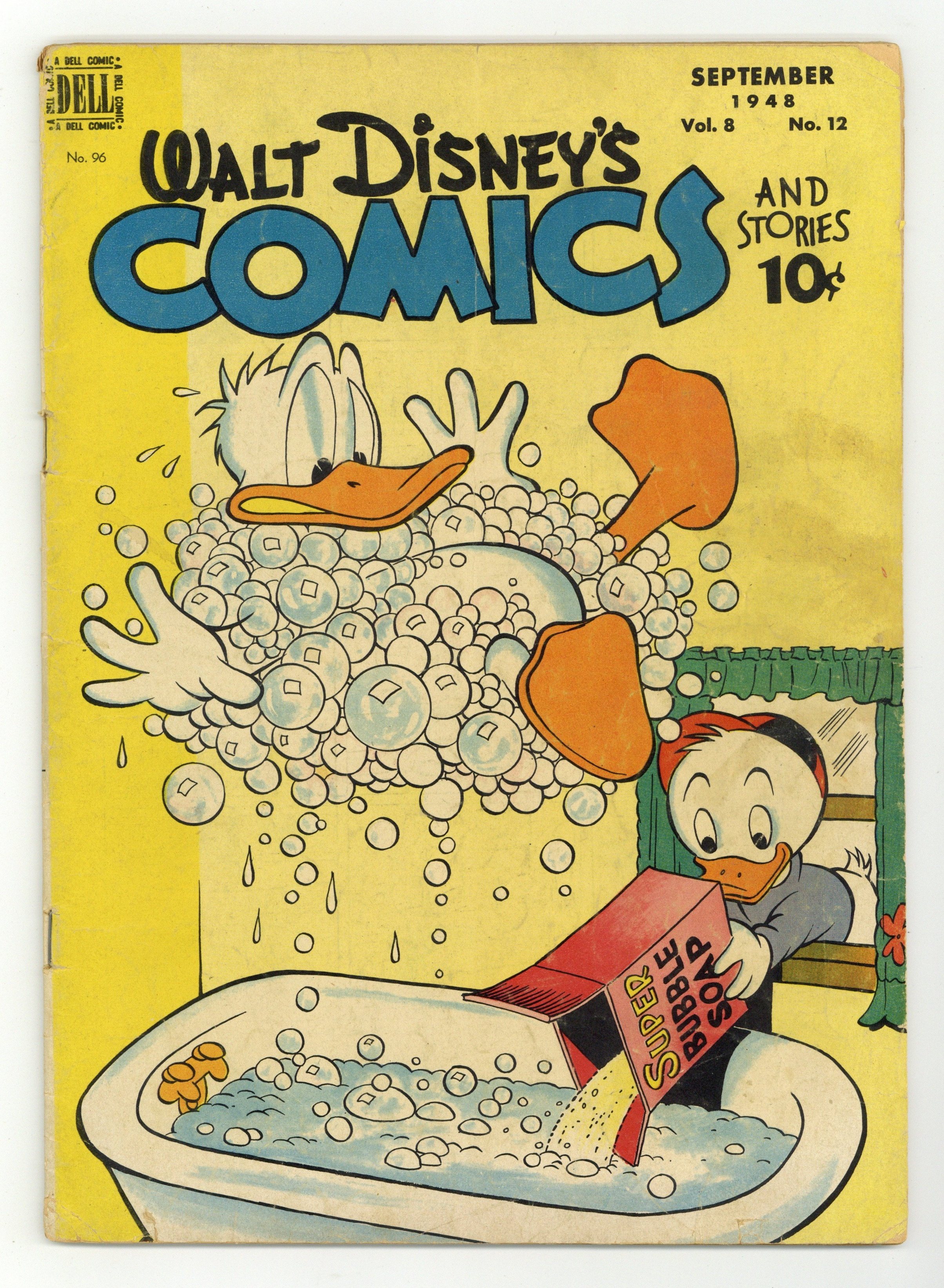 Cover by Carl Barks. Stories and art by Carl Barks, Floyd Gottfredson, Bill Walsh, Dick Moores, Bob Karp, Hubie Karp, Ralph Heimdahl, Harvey Eisenberg, Gil Turner, George Waiss, Bill Wright, and Al Taliaferro. Sometimes listed as Vol. 8 #12. The long-running vehicle for Disney character comics featured work by Carl Barks, Floyd Gottfredson, and Pogo's Walt Kelly. A young tugboat can't seem to stay out of trouble, in an adaptation of Little Toot from the Disney film Melody Time. In a story by Barks, Donald's nephews, working as caddies, trick him into an absurd golf bet with Gladstone. Donald likes the looks of a duckbill platypus. Donald Duck; Bucky Bug; Li'l Bad Wolf; Mickey Mouse; Donalds Happy Birthday; Pueblo Pluto; The Big Top; Little Toot. 48 pages, Full Color. Cover price $0.10.