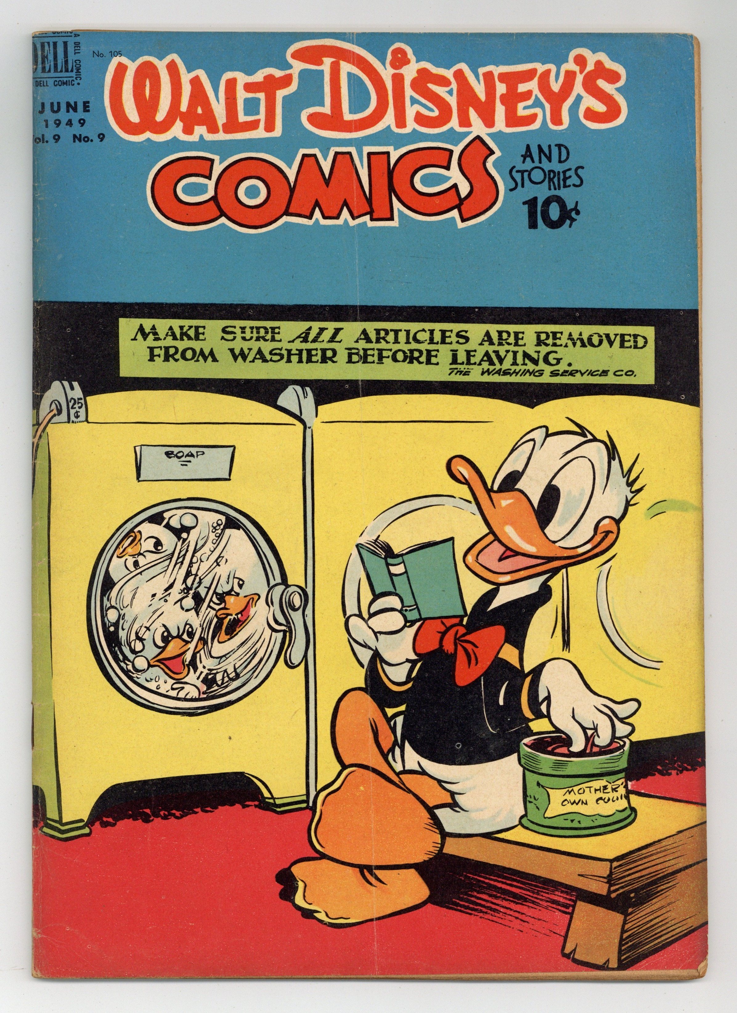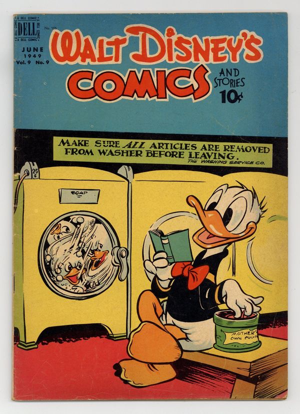 Tags: Disney Ducks & MicePublished Jun 1949 by Dell/Gold Key.$22.50Cover by Walt Kelly. Stories and art by Carl Barks, Floyd Gottfredson, Bill Walsh, Dick Moores, Bob Karp, Hubie Karp, Merrill De Maris, Tony Strobl, Gil Turner, George Waiss, Bill Wright, Manuel Gonzales, and Al Taliaferro. Sometimes listed as Vol. 9 #9. The long-running vehicle for Disney character comics featured work by Carl Barks, Floyd Gottfredson, and Pogo's Walt Kelly. In a classic story from the Mickey Mouse comic strip, Mickey discovers the Phantom Blot wants a slip of paper hidden inside an old camera. In a story by Barks, Donald doesn't know his nephews are supplying his echoes. Dumbo the elephant runs away from home. Donald Duck; Bucky Bug; Li'l Bad Wolf; Mickey Mouse; Dumbo the Flying Elephant; Plutos Picnic; Mickey Mouse Outwits the Phantom Blot. 48 pages, Full Color. Cover price $0.10.