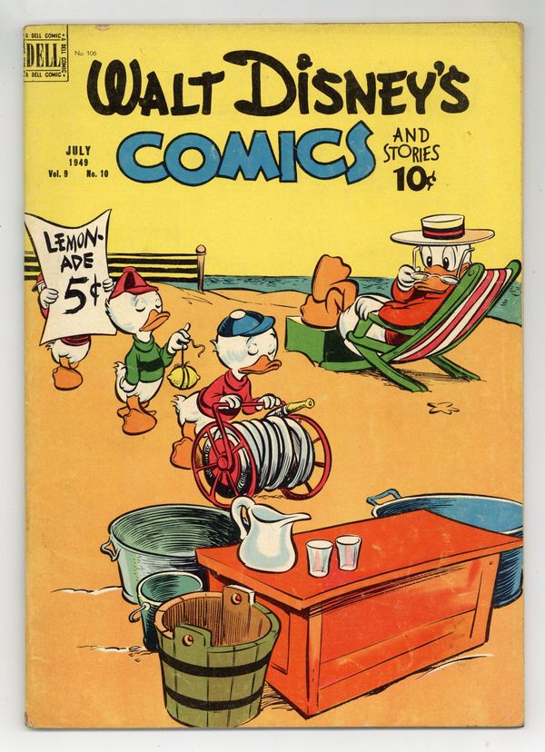Tags: Disney Ducks & MicePublished Jul 1949 by Dell/Gold Key.$23.50Cover by Walt Kelly. Stories and art by Carl Barks, Floyd Gottfredson, Bill Walsh, Dick Moores, Bob Karp, Merrill De Maris, Tony Strobl, Gil Turner, George Waiss, Bill Wright, Manuel Gonzales, and Al Taliaferro. Sometimes listed as Vol. 9 #10. The long-running vehicle for Disney character comics featured work by Carl Barks, Floyd Gottfredson, and Pogo's Walt Kelly. In a classic story from the Mickey Mouse comic strip, Mickey goes after the Phantom Blot in a climactic speedboat-plane chase. In a story by Barks, Huey, Dewey and Louie's new pets defend the home from the Black Mask Burglar. Pluto dreams of a world where dogs own humans as pets! Donald Duck; Bucky Bug; Li'l Bad Wolf; Mickey Mouse; Dumbo the Flying Elephant; Plutos Picnic; Mickey Mouse Outwits the Phantom Blot. 48 pages, Full Color. Cover price $0.10.