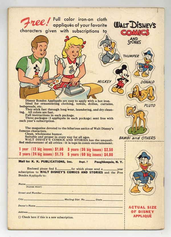 Cover by Walt Kelly. Stories and art by Carl Barks, Floyd Gottfredson, Bill Walsh, Dick Moores, Bob Karp, Merrill De Maris, Tony Strobl, Gil Turner, George Waiss, Bill Wright, Manuel Gonzales, and Al Taliaferro. Sometimes listed as Vol. 9 #10. The long-running vehicle for Disney character comics featured work by Carl Barks, Floyd Gottfredson, and Pogo's Walt Kelly. In a classic story from the Mickey Mouse comic strip, Mickey goes after the Phantom Blot in a climactic speedboat-plane chase. In a story by Barks, Huey, Dewey and Louie's new pets defend the home from the Black Mask Burglar. Pluto dreams of a world where dogs own humans as pets! Donald Duck; Bucky Bug; Li'l Bad Wolf; Mickey Mouse; Dumbo the Flying Elephant; Plutos Picnic; Mickey Mouse Outwits the Phantom Blot. 48 pages, Full Color. Cover price $0.10.
