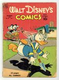 Cover by Carl Barks. Stories and art by Carl Barks, Floyd Gottfredson, Bill Walsh, Dick Moores, Bob Karp, Gil Turner, George Waiss, Bill Wright, Manuel Gonzales, and Al Taliaferro. Sometimes listed as Vol. 10 #1. The long-running vehicle for Disney character comics featured work by Carl Barks, Floyd Gottfredson, and Pogo's Walt Kelly. In a classic story from the Mickey Mouse comic strip, Mickey gets a clue to the ghosts' secrets when he finds secret passages in Colonel Bassett's mansion. In a story by Barks, Donald is skeptical that his nephews' divining rod really works. Pinocchio leads the search after Gepetto's fish Cleo is fishnapped. Donald Duck; Bucky Bug; Li'l Bad Wolf; Mickey Mouse; Apples for the Teacher; Pinocchio; Mickey Mouse in the House of Seven Haunts. 48 pages, Full Color. Cover price $0.10.