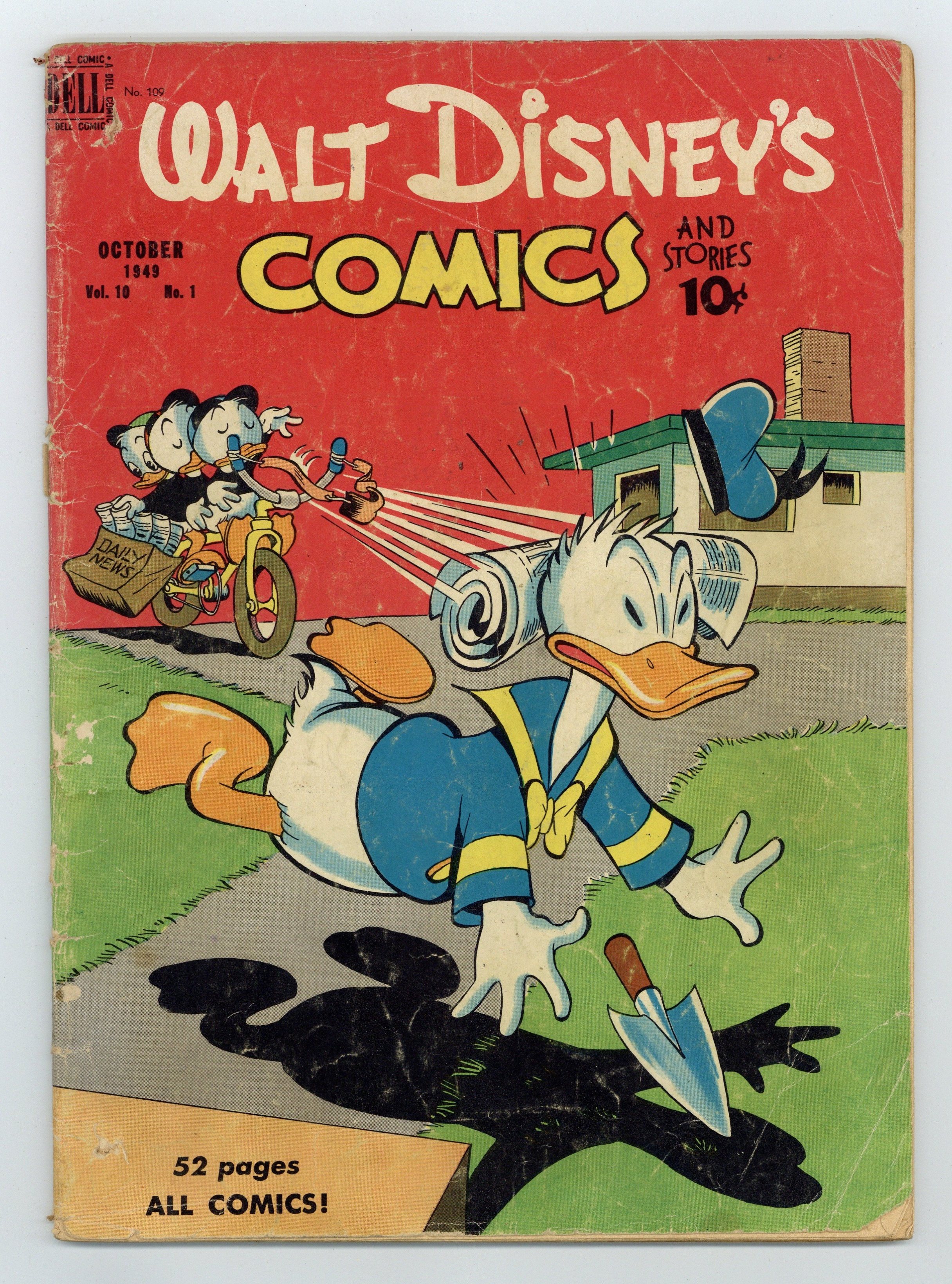 Tags: Disney Ducks & MicePublished Oct 1949 by Dell/Gold Key.$16.00- Cover-to-cover punctures along spine. Cover detached at one staple. Water damage. Cover oxidation.