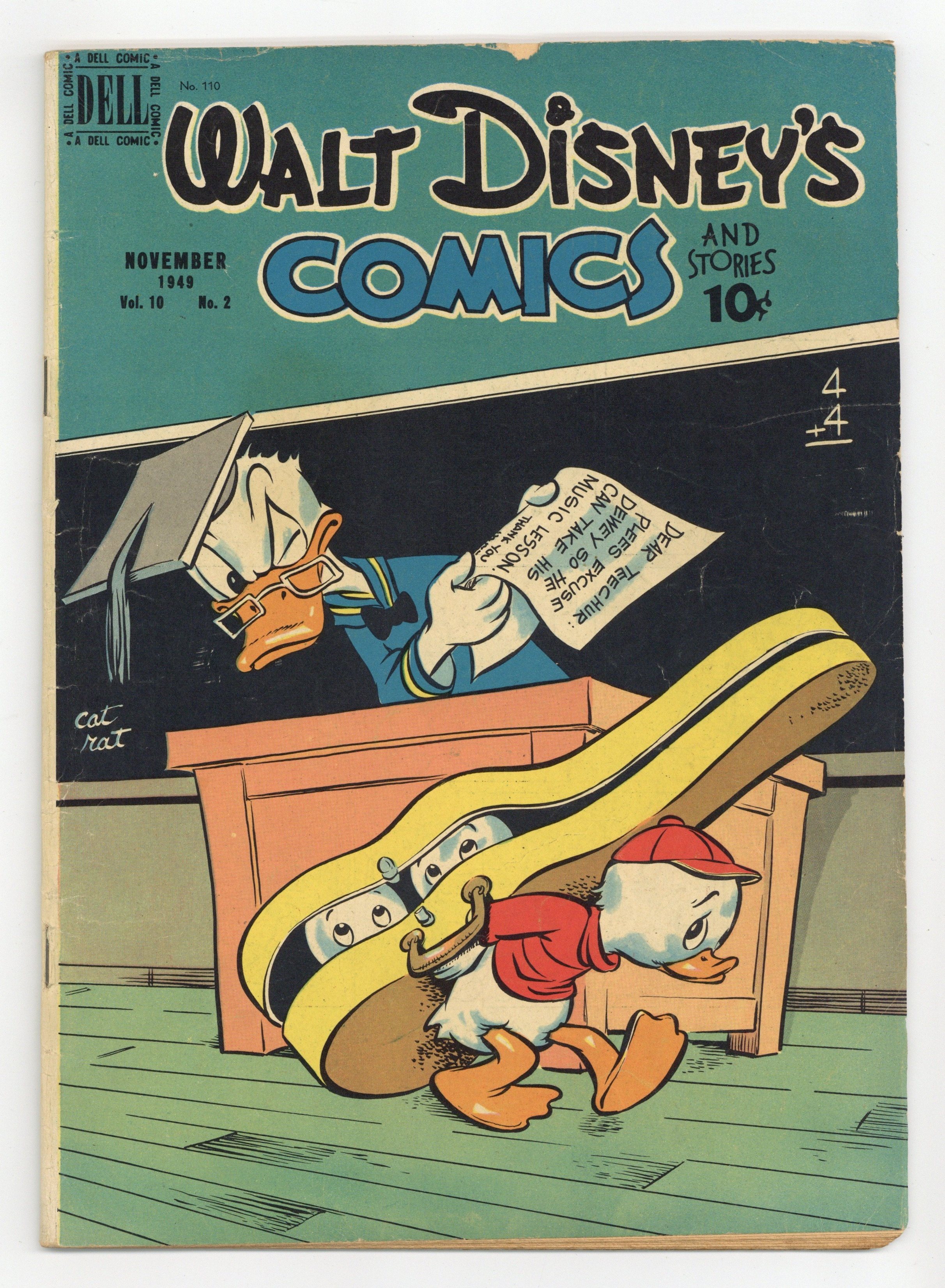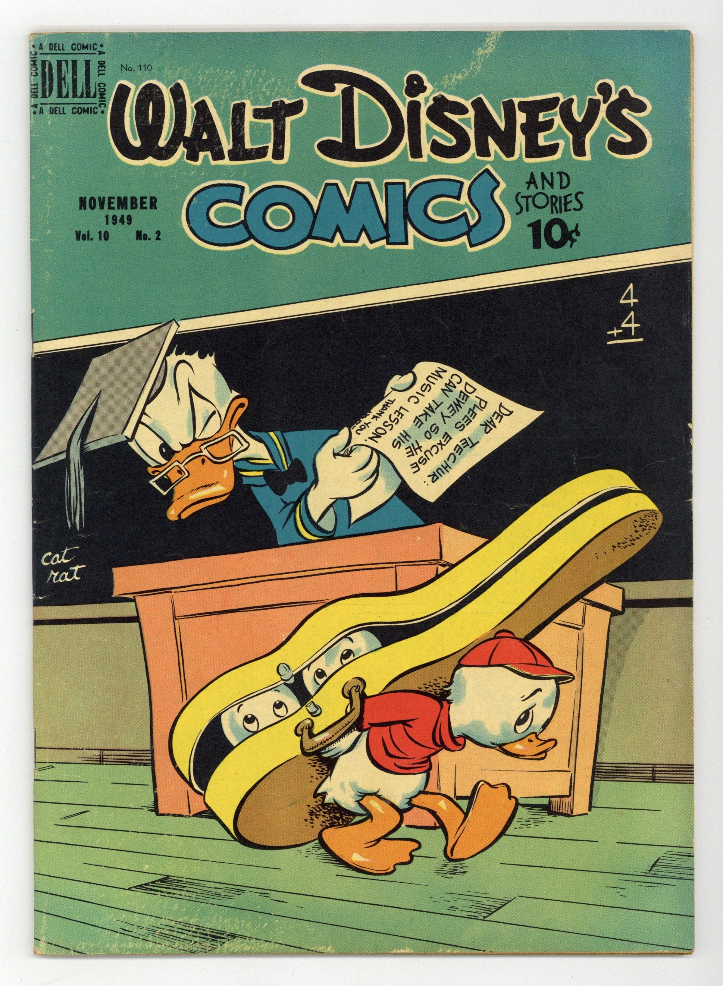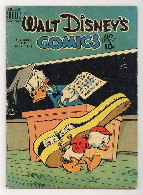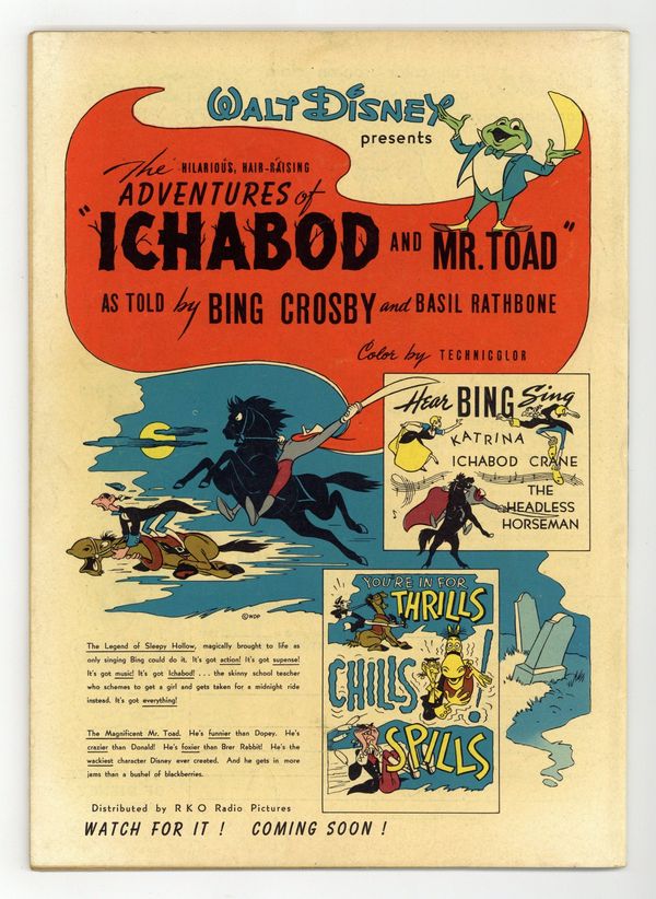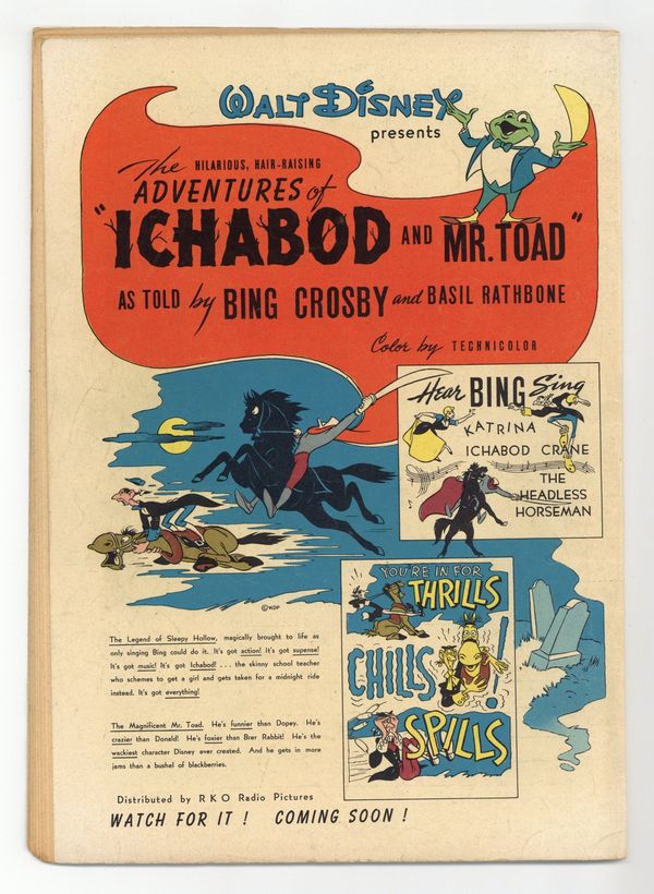 Tags: Disney Ducks & MicePublished Nov 1949 by Dell/Gold Key.$35.50Cover by Carl Barks. Stories and art by Carl Barks, Floyd Gottfredson, Bill Walsh, Dick Moores, Bob Karp, Ted Osborne, Tony Strobl, George Waiss, Bill Wright, Vive Risto, and Al Taliaferro. Sometimes listed as Vol. 10 #2. The long-running vehicle for Disney character comics featured work by Carl Barks, Floyd Gottfredson, and Pogo's Walt Kelly. In a classic story from the Mickey Mouse comic strip, Mickey tracks the seven ghosts to a cave underneath Colonel Bassett's house. In a story by Barks, Donald encounters bears and Gladstone Gander while picking up his nephews from Camp Waha-Go-Gaga. Li'l Bad Wolf goes after pirate treasure. Donald Duck; Bucky Bug; Li'l Bad Wolf; Mickey Mouse; Minnies New Pets; Pinocchio; Mickey Mouse in the House of Seven Haunts. 48 pages, Full Color. Cover price $0.10.