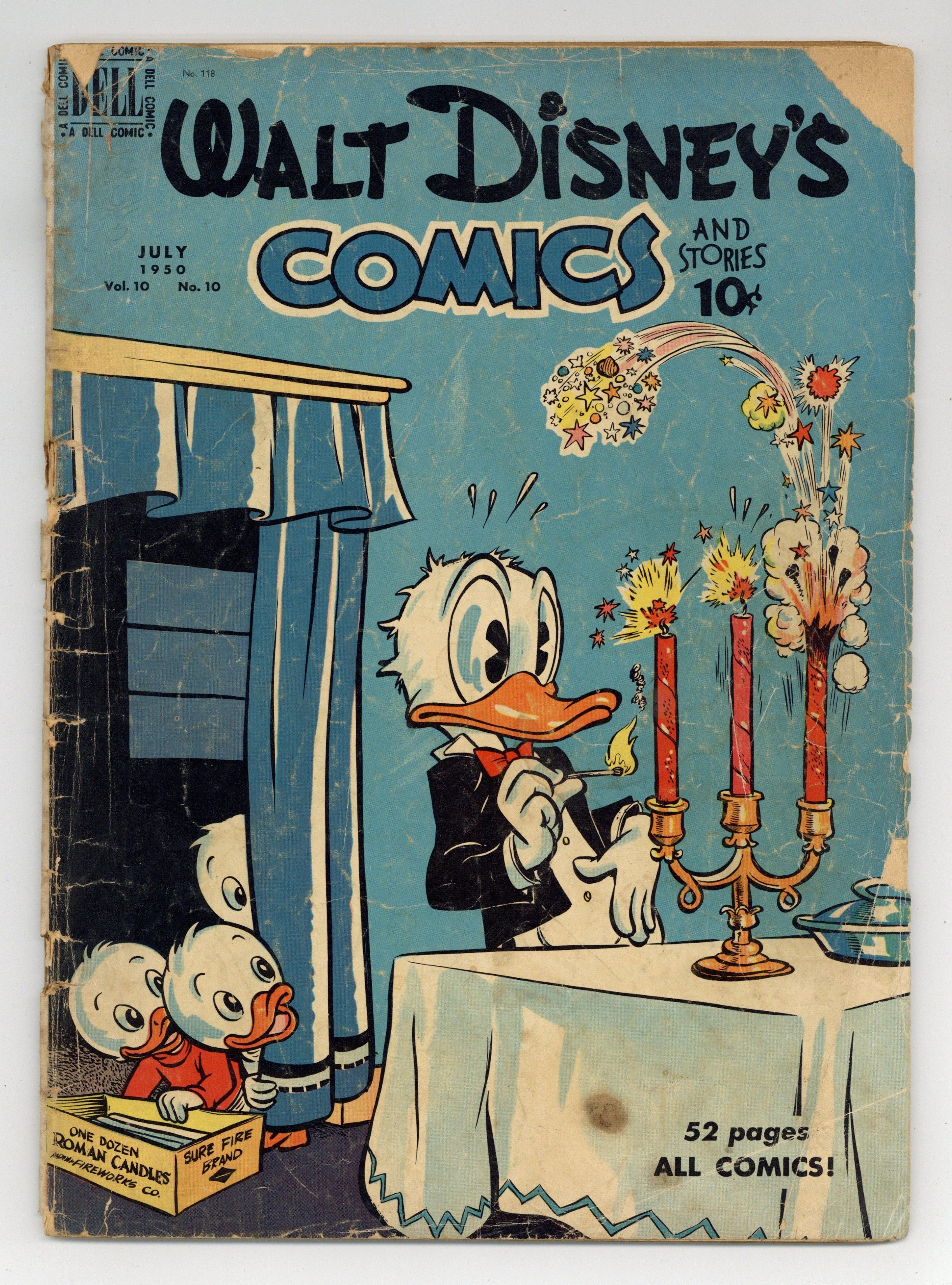 Tags: Disney Ducks & MicePublished Jul 1950 by Dell/Gold Key.$7.00- 3 1/2" cumulative spine split. Cover detached at one staple. Cover oxidation with chipping. Water damage.