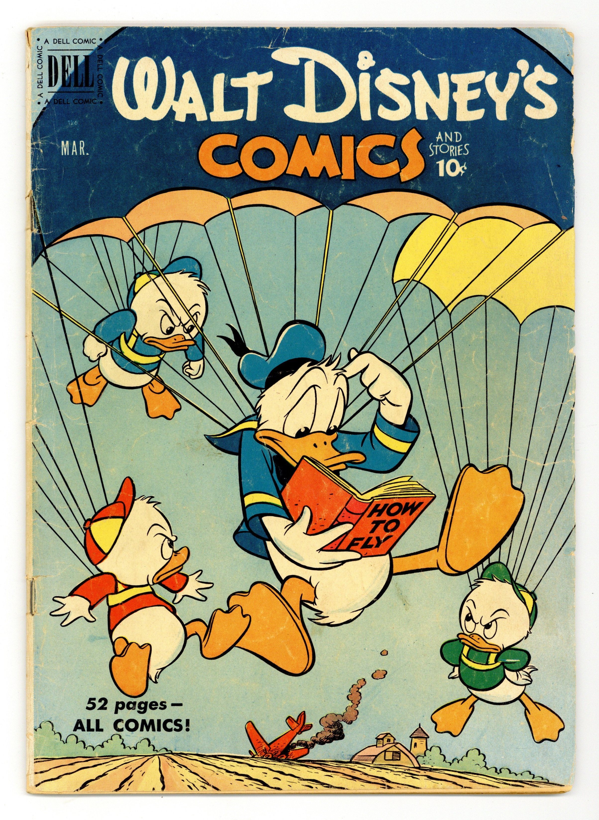 Cover by Carl Buettner. Stories and art by Carl Barks, Floyd Gottfredson, Merrill De Maris, Bob Karp, Gil Turner, Bob Moore, George Waiss, Bill Wright, and Al Taliaferro. Sometimes listed as Vol. 11 #6. The long-running vehicle for Disney character comics featured art by Carl Barks, the legendary Good Duck Artist. In a classic story from the Mickey Mouse comic strip, Mickey's old foe Pete interferes in the plan to save the old whaling boat. In a story by Barks, Uncle Scrooge hides his fortune on a remote farm, but he didn't reckon on tornadoes. The Big Bad Wolf attempts to join the Foul Fellows Club, but Practical Pig's practical jokes are an obstacle. Donald Duck; Grandma Duck; Li'l Bad Wolf; Mickey Mouse; Goofy's Bank; Mickey Mouse: Mighty Whale Hunter. 48 pages, Full Color. Cover price $0.10.