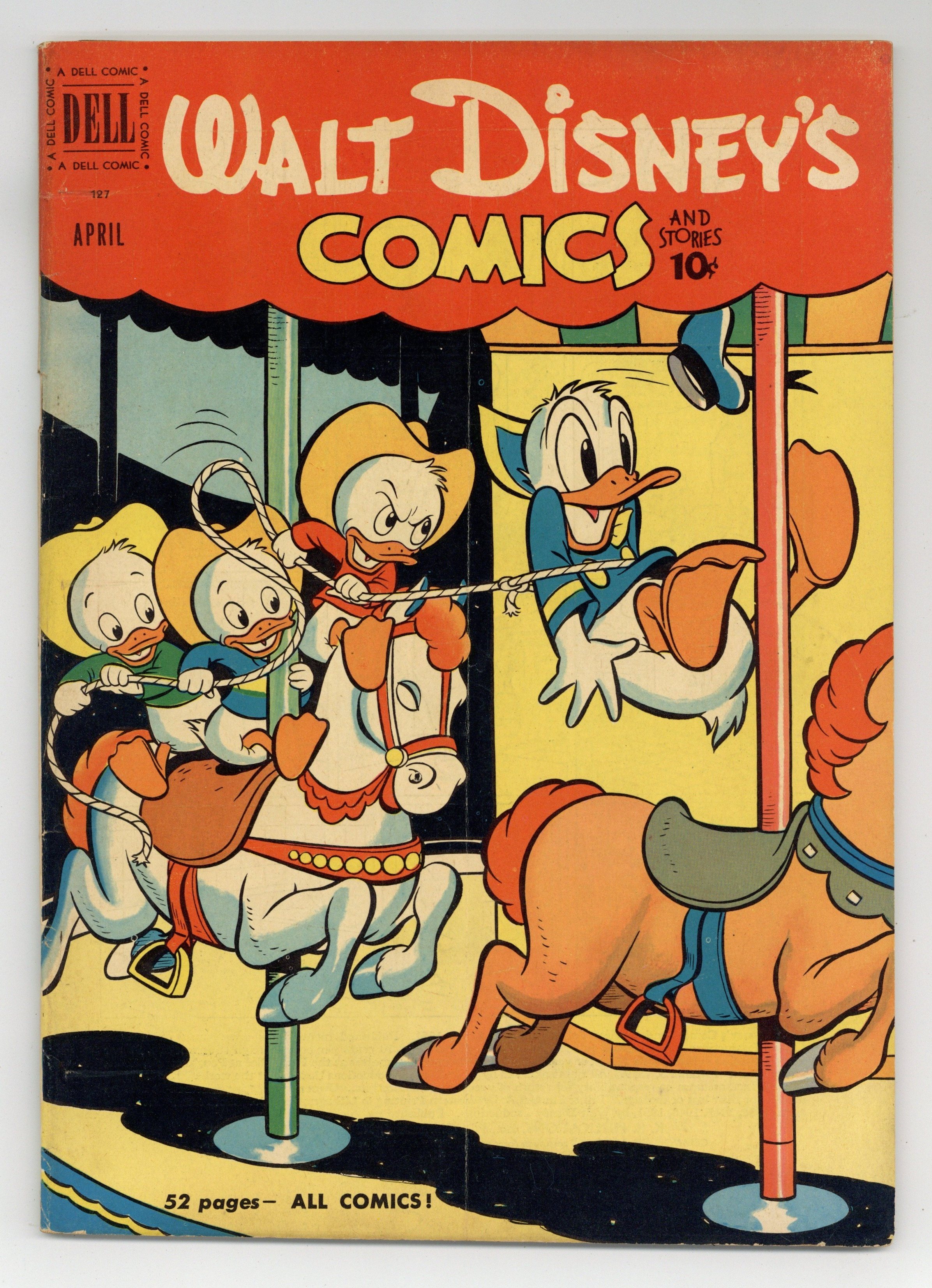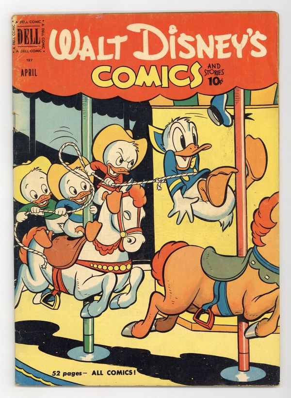 Cover by Carl Buettner. Stories and art by Carl Barks, Floyd Gottfredson, Merrill De Maris, Bill Walsh, Manuel Gonzales, Bob Karp, Gil Turner, Bill Wright, and Al Taliaferro. Sometimes listed as Vol. 11 #7. The long-running vehicle for Disney character comics featured art by Carl Barks, the legendary Good Duck Artist. In a classic story from the Mickey Mouse comic strip, Mickey's old foe Pete interferes in the plan to save the old whaling boat. In a story by Barks, Huey, Dewey and Louie try to play an April Fool's trick on Donald. Daisy proves to be more than capable of fending off a mugger. Donald Duck; Grandma Duck; Li'l Bad Wolf; Mickey Mouse; Minnies Garden; Mickey Mouse: Mighty Whale Hunter. 48 pages, Full Color. Cover price $0.10.