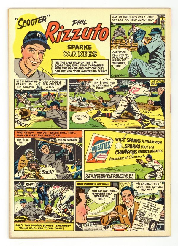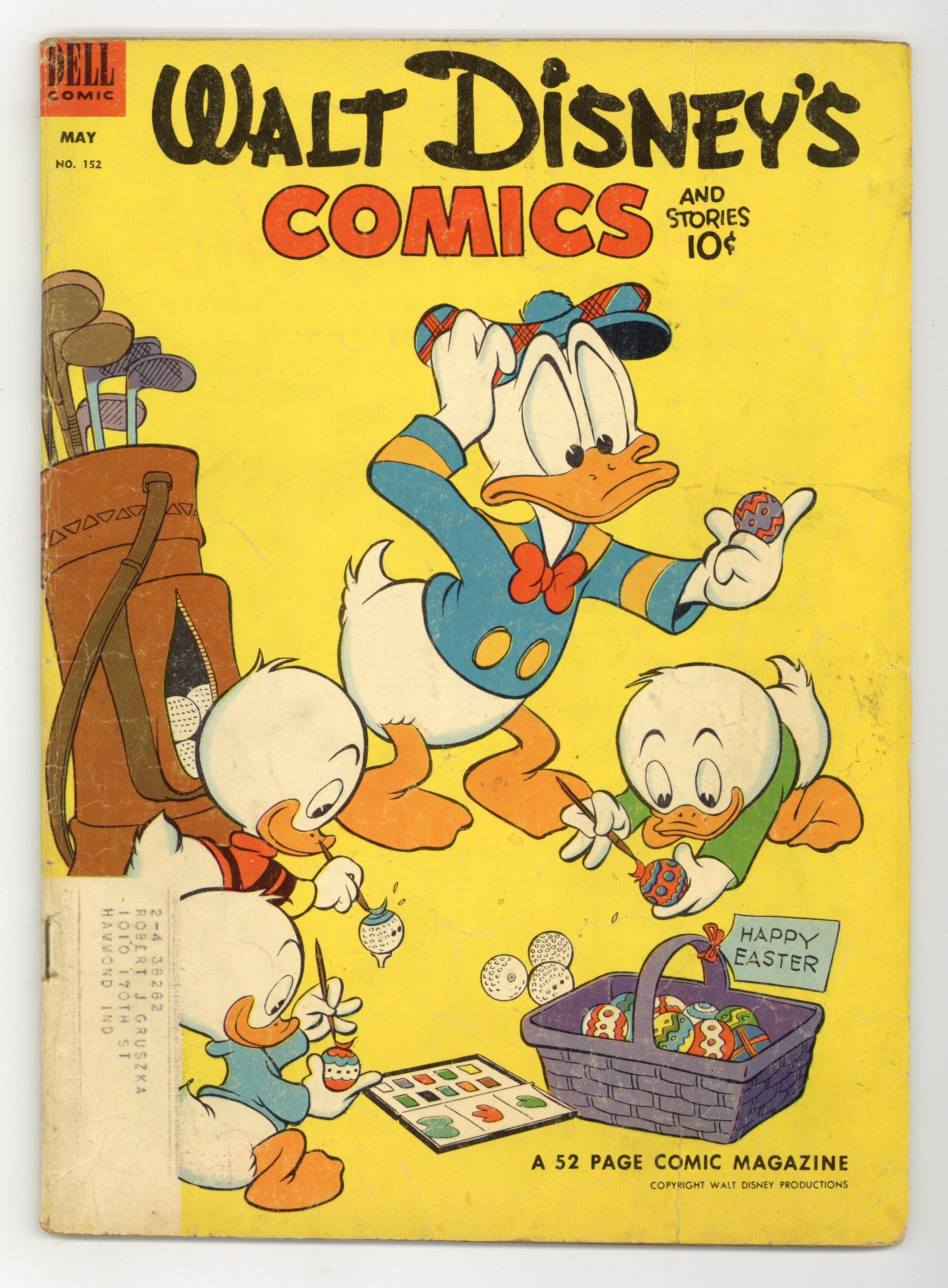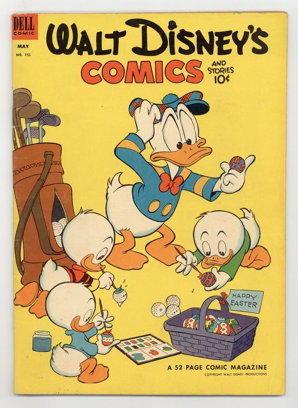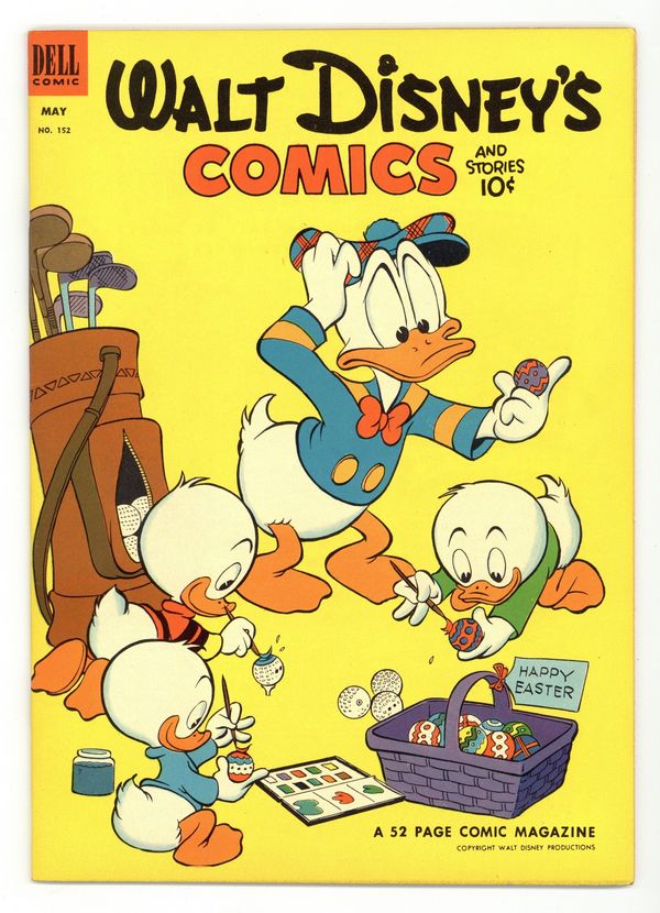 Cover by Carl Barks. Stories and art by Carl Barks, Merrill De Maris, Bill Walsh, Carl Fallberg, Paul Murry, Manuel Gonzales, Bob Karp, Don Christensen, Frank McSavage, Gil Turner, Lee Hooper, and Al Taliaferro. Sometimes listed as Vol. 13 #8. The long-running vehicle for Disney character comics featured art by Carl Barks, the legendary Good Duck Artist. Mickey and Goofy go to a vacation resort where mysterious events seem to be warning them off. This is the first Mickey Mouse adventure created for Walt Disney's Comics and Stories by the long-running team of Carl Fallberg and Paul Murry. In a story by Barks, Donald tries to do something special to get on a TV quiz show. Goofy digs a hole to China in his backyard. Donald Duck; Li'l Bad Wolf; Pluto; Little Hiawatha; Thumpers Easter Poem; Grandma Duck; Mickey Mouse: The Last Resort. 48 pages, Full Color. Cover price $0.10.