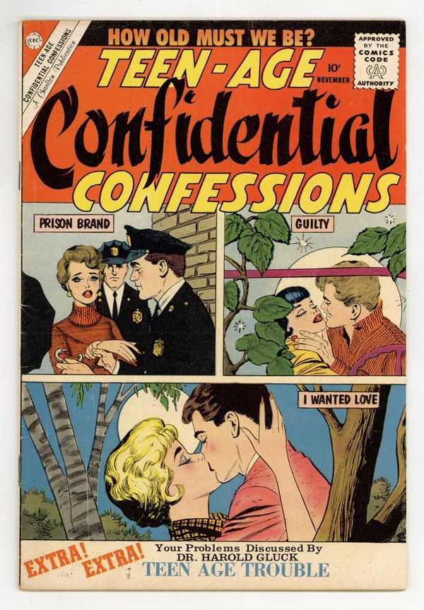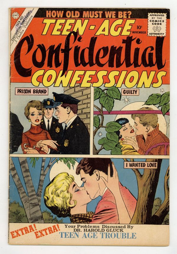 Published Nov 1960 by Charlton Comics Group.$72.00Cover art by Dick Giordano. "I Wanted Love," pencils by Joe Sinnott, inks by Vince Colletta; Madges parents are very wealthy but they spend little time with her; While attending an exclusive finishing school, Madge and some friends sneak out to a road house; Madge meets working class boy Jack, and they fall in love; Jack suggests they elope but the police intervene and prevent the ceremony. "Guilty!", inks by Vince Colletta; Peg, whose family is poor, dates Bruce, the son of a "rich and socially prominent family"; Pegs ex-boyfriend Dave warns her against Bruce and his "wild crowd," and Pegs father forbids her to date him; Peg sneaks out to a nightclub with Bruce; hes driving her home when he hits a pedestrian and doesnt stop. "Prison Brand," pencils by Joe Sinnott, inks by Vince Colletta; Anna, an impoverished orphan raised by her aunt, meets Frank and he asks her for a date; Frank gets her a job as a hat check girl at a nightclub; One night, Frank leaves Anna in his car while he attempts to rob a jewelry store; Anna is charged as an accomplice. "Wild Party!", pencils by Charles Nicholas (as ChaSal), inks by Sal Trapani (as ChaSal); Babs hangs around with a wild crowd; over her mothers objections, she goes to a party with Hank; As Hank is kissing Babs, Marty takes a photograph of them; A short time later, the photo appears in a magazine, illustrating an article about teen delinquency; Babs father days "youve made us scum in the eyes of the world." "For The Love Of Mike," inks by Vince Colletta; Sisters Anne and Milly run a restaurant on the edge of the desert; Mike works for and also romances both of them, unable to choose; One day, Hal and Keith are stranded at the restaurant by a storm; Anne finds herself attracted to Keith, and Milly to Hal. 36 pgs., full color. Cover price $0.10.