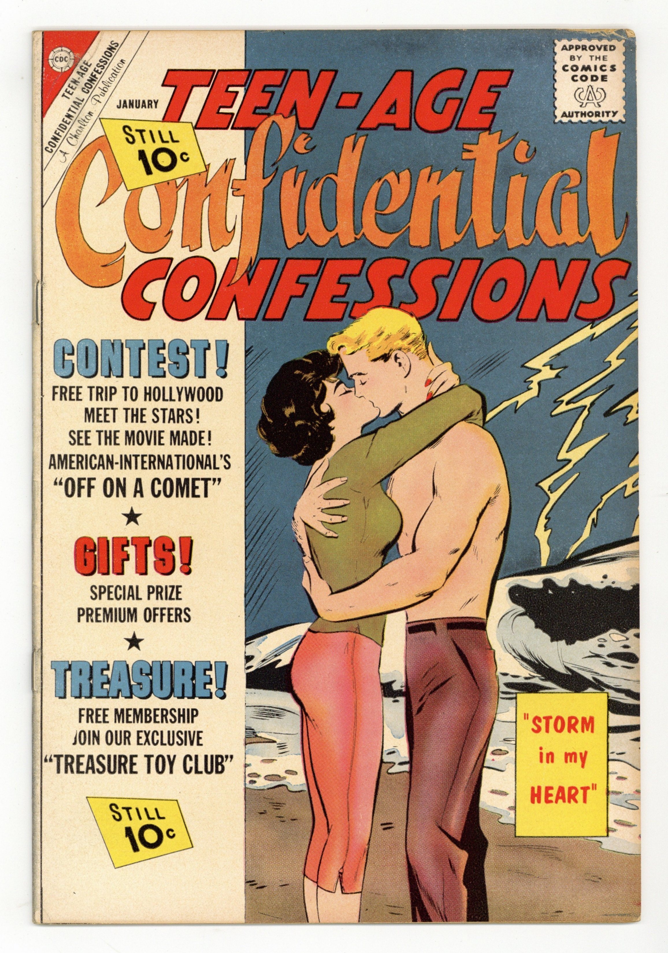 Cover by Vince Colletta. Stories and art by Joe Sinnott, Charles Nicholas, Sal Trapani and Vince Colletta. Charlton's romance comic captures the emerging teen culture of the early 1960s, when surfing, hot rods and new fashions in dance and dress swept America. Jenny falls for married man Carl and sets her small town talking, in a story featuring art by future Fantastic Four legend Joe Sinnott. Jilted Claire falls for handsome neighbor Leo when a storm hits their island vacation cottages. In a wacky story for this title, inventor Isabelle creates a way to keep her easily distracted boyfriend from wandering off with some other woman. Plus a vintage ad for a contest to visit the set of legendary B-movie producer American International's "Off on a Comet" - a movie that was never actually made. Love Can't Wait; Storm in My Heart; Isabells Inventions: The Hand Holder; Are You a Criticizing Carrie?; My Heart, the Puppet. 32 pages, Full Color. Cover price $0.10.