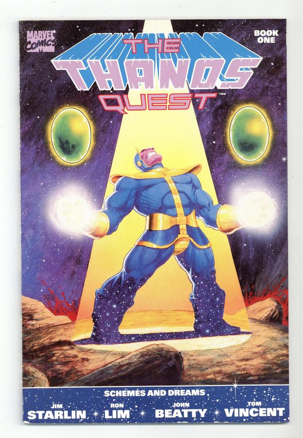 1st Printing. "Schemes and Dreams!" Written by Jim Starlin. Art by Ron Lim John Beatty. Six Soul Gems. NOTE: This tale picks up after the events of Silver Surfer (1987 2nd Series) #38. Thanos the Mad Titan has been resurrected by the entity known as Death. Resurrected and given a dark mission. In order to accomplish this mission, Thanos will seek ultimate power - the Soul Gems! Individually, they contain power beyond comprehension. Together, they could destroy a universe. And Thanos must have them all.… Featuring the Elders of the Universe Champion and Gardiner, and the nefarious In-Betweener. 48 pages, FC Cover price $4.95.