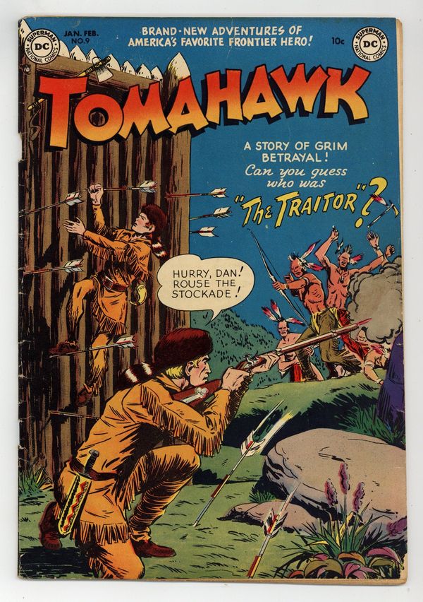 Cover art by Fred Ray. The Five Doomed Men starring Tomahawk, art by Bruno Premiani. The Wisdom of Great Owl starring Tomahawk, art by Bruno Premiani. Bull Boat, Dugout Canoe--Indian Album fact page by Al McLean. The Red Pipe-Stone Quarry article byTom Galloway, art by Raymond Perry. Little Pocahontas humor half-page by Henry Boltinoff. Little Pocahontas fact page by Henry Boltinoff. The Traitor starring Tomahawk, art by Bruno Premiani. In all of North America during the 16th century fact page by Morris Waldinger. 44 Pages, Full Color. Cover price $0.10.