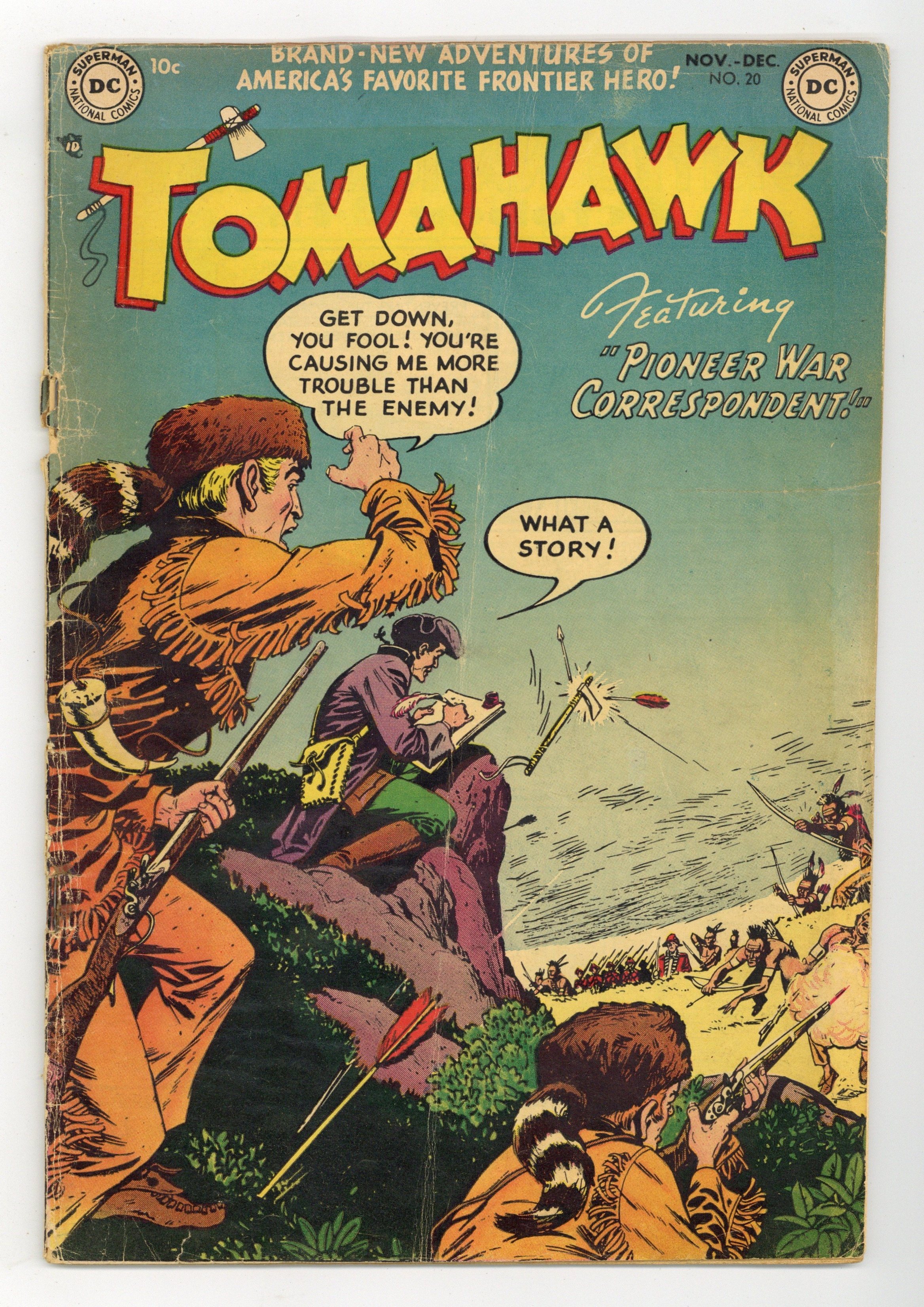 Cover art by Nick Cardy. The Retreat of Tomahawk, art by Bruno Premiani. Pioneer War Correspondent starring Tomahawk, art by Bruno Premiani. The Legend of the Shining Canoe--Tales of the Arrow Maker, art by Fred Ray. The Mississippi River Pirates starring Tomahawk, pencils by Bruno Premiani, inks by Ray Burnley. 44 Pages, Full Color. Cover price $0.10.
