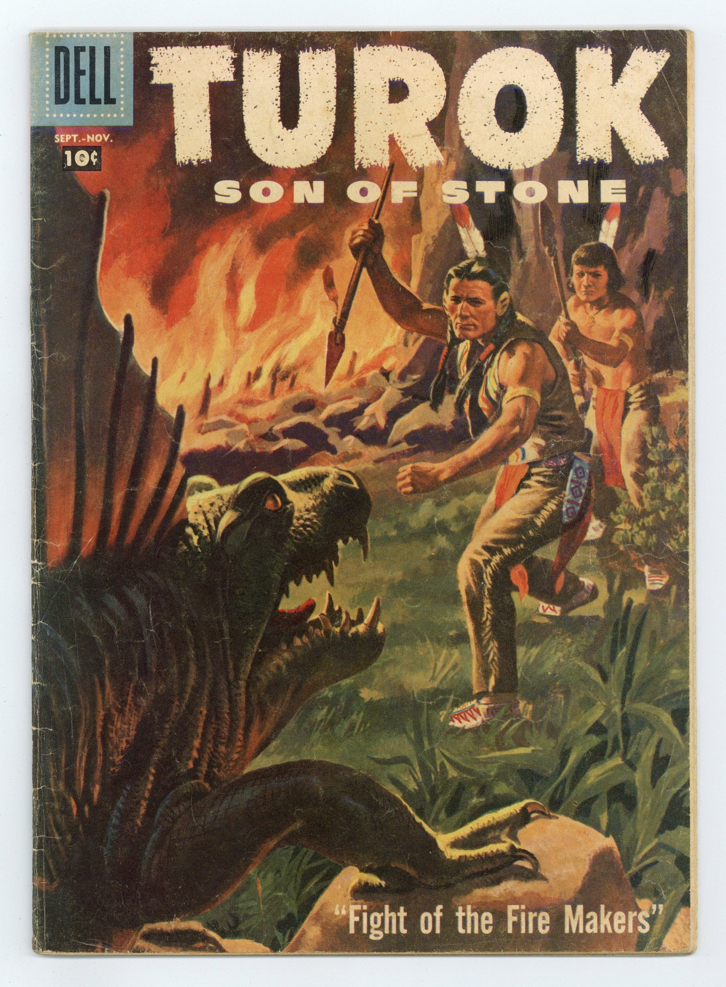 Cover by Mo Gollub. Written by unknown. Art by Ray Bailey and Rex Maxon. Turok and Andar in "Fight of the Fire Makers" and "The Tree Men," with art by Ray Bailey. Plus: Young Earth back-up story "The Plight of the Plesiosaur," with art by Rex Maxon. Also: "The History of the Horse" 1-pager. And: 1-page text story "Lair of the Sabertooth." 36 pages, full color. Cover price $0.10.