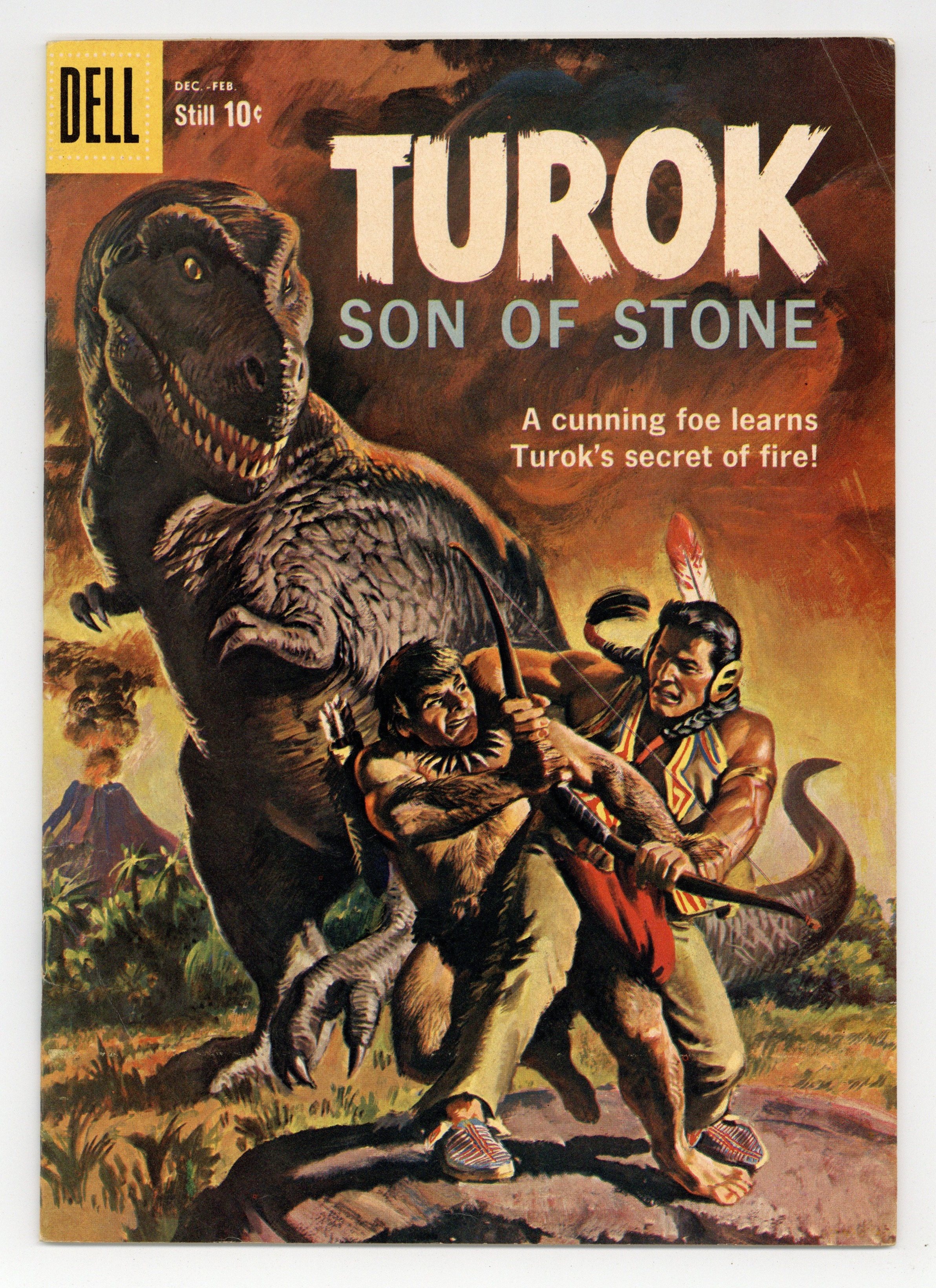 Painted cover. Turok in "The Cunning Foe" in which Turok and Andar teach a caveman how to make fire who then uses it for evil and "The Monster of the Depths" in which Turok and Andar discover a tribe of cavemen in a land beneath the water. Issue also has backup feature "Young Earth - The Past Is Present" and a one-page text feature "The Weapon." No art/story credits given. 36 pages, full color. Cover price $0.10.
