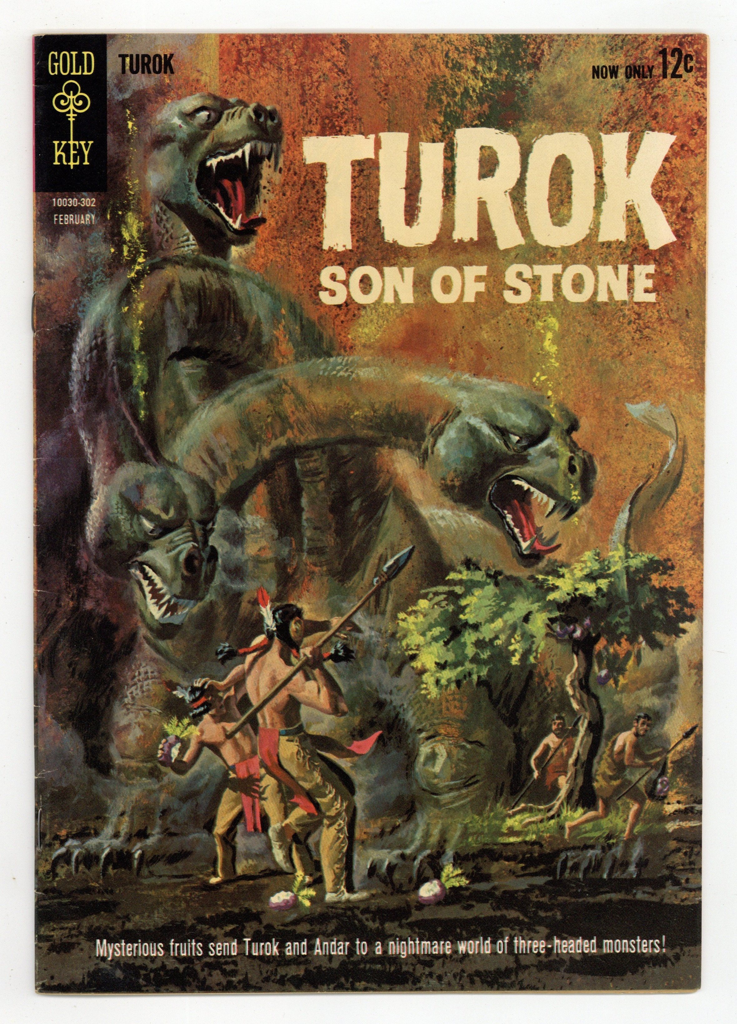 Painted cover. Turok in "Valley of the Dangerous Dreams" in which Turok and Andar battle deadly illusions and "Prey of the Cave Monster" in which Turok searches for Andar who has disappeared down river. Issue also has backup feature "Young Earth - Creatures of the Grasslands," a one-page text feature "The Test," and one-page strips. No art/story credits given. No ads in book. Entire issue from cover to cover is comic stories and one-page strips. Back cover is pinup of front cover illustration. 36 pages, full color. Cover price $0.12.