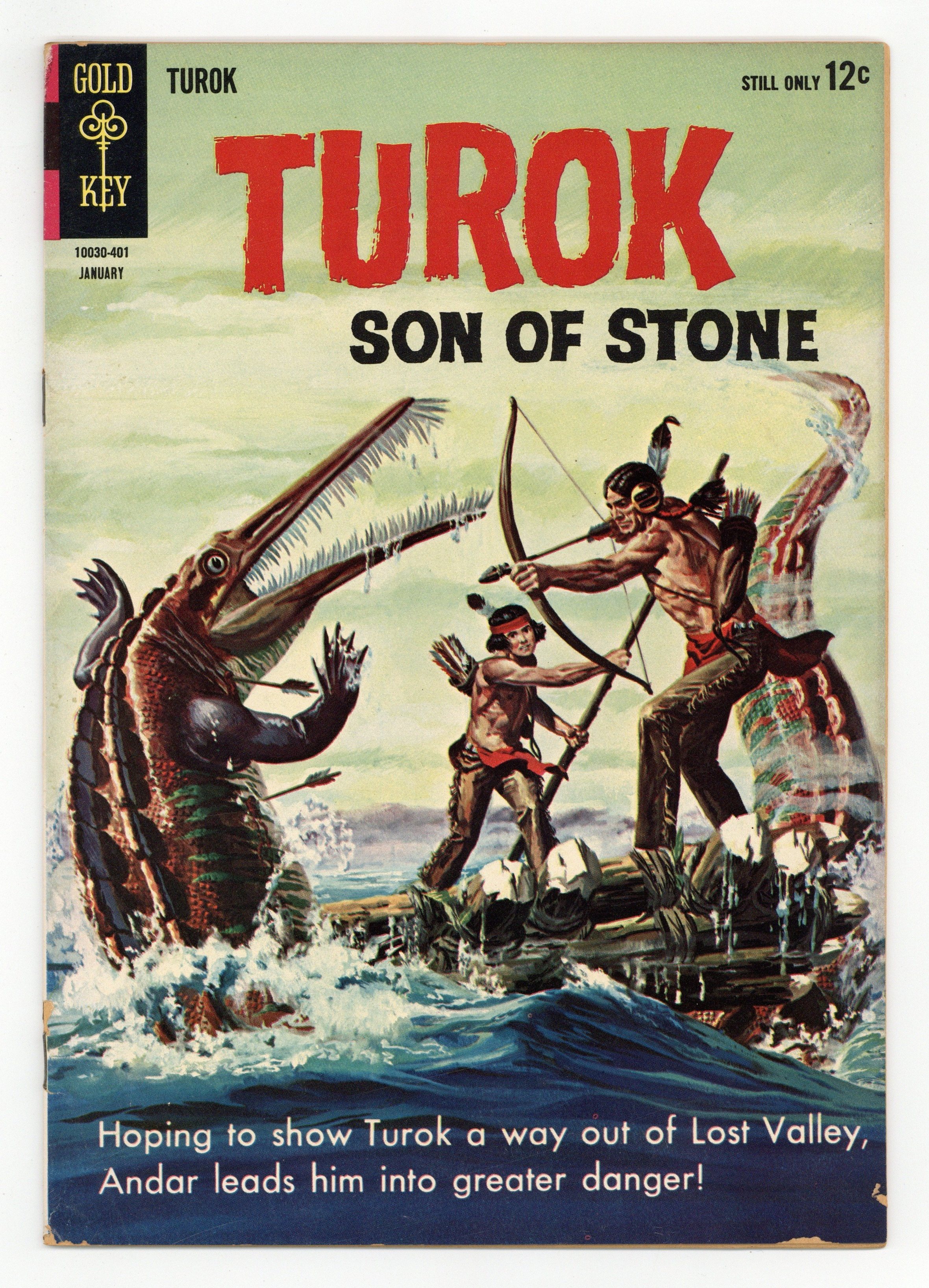 Painted cover. Turok in "Prey of the Flying Monsters" in which Turok and Andar's attempts to escape from the lost valley leads to threats from the sky and "Scavenger of the Storm" in which Turok and Andar try to find one another after being separated by a battle and a storm. Issue also has backup feature "Young Earth - The Hunter," a one-page text feature "Man's Early Weapons: The Bow and Arrow," and one-page strips. No art/story credits given. Cover price $0.12.
