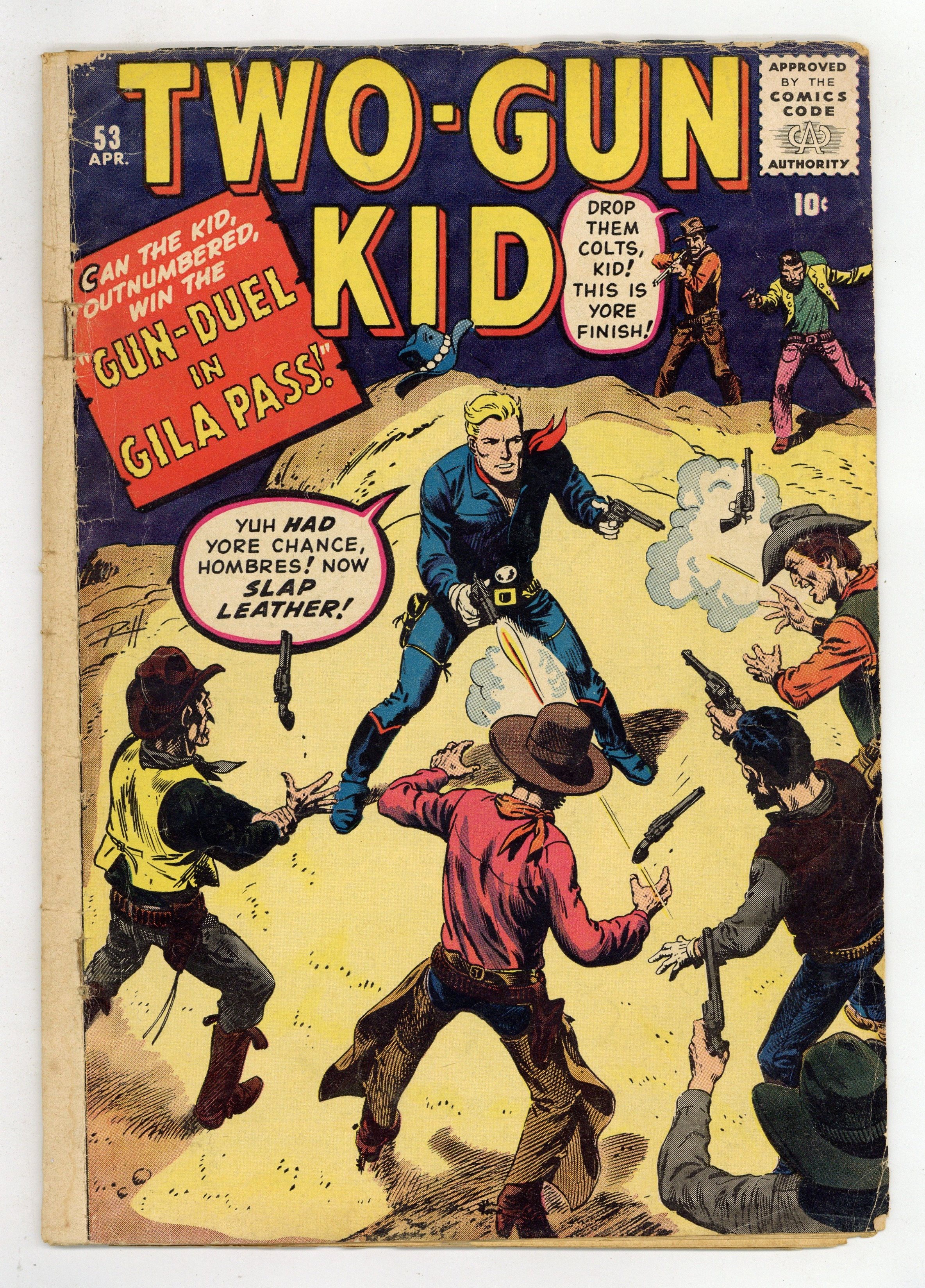 Cover by Russ Heath. "The Sheriff's Showdown," script by Stan Lee, art by John Severin; The Two-Gun Kid is camping on the range when he is suddenly woken by the arrival of Dance Drago and his gang. Untitled story, script by Stan Lee, art by John Severin; The Two-Gun Kid is riding past Gila City he spots the locals fleeing out of the city; the town has been taken over by the Harper gang. "Revenge," script by Stan Lee, pencils by Ross Andru, inks by Mike Esposito. "Deputy's Puzzle" text story. "Colts Blaze In Booneville," script by Stan Lee, art by John Severin; The Two-Gun Kid is in the town of Booneville where he is suddenly confronted by a bunch of locals who are part of a committee to keep the town decent; they tell the Two-Gun Kid to clear out or be chased out. 36 pgs., full color. $0.10. Cover price $0.10.