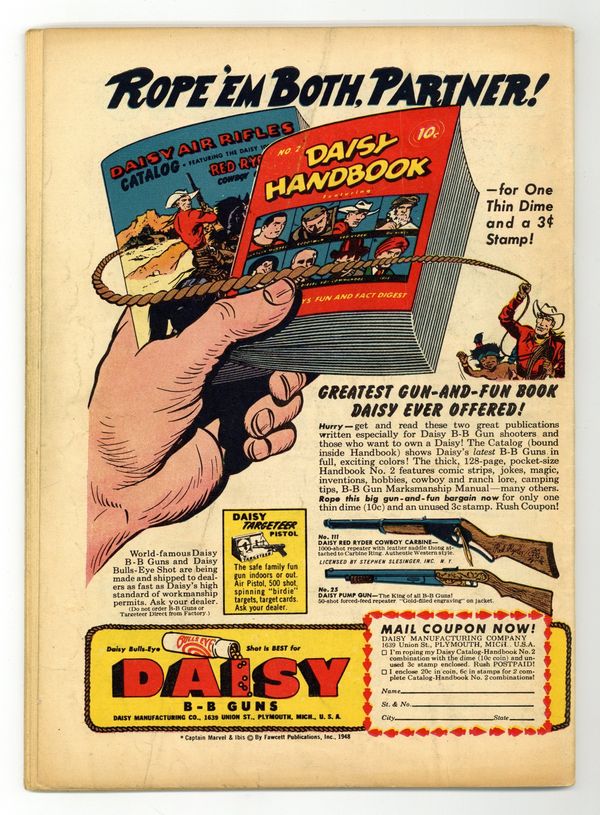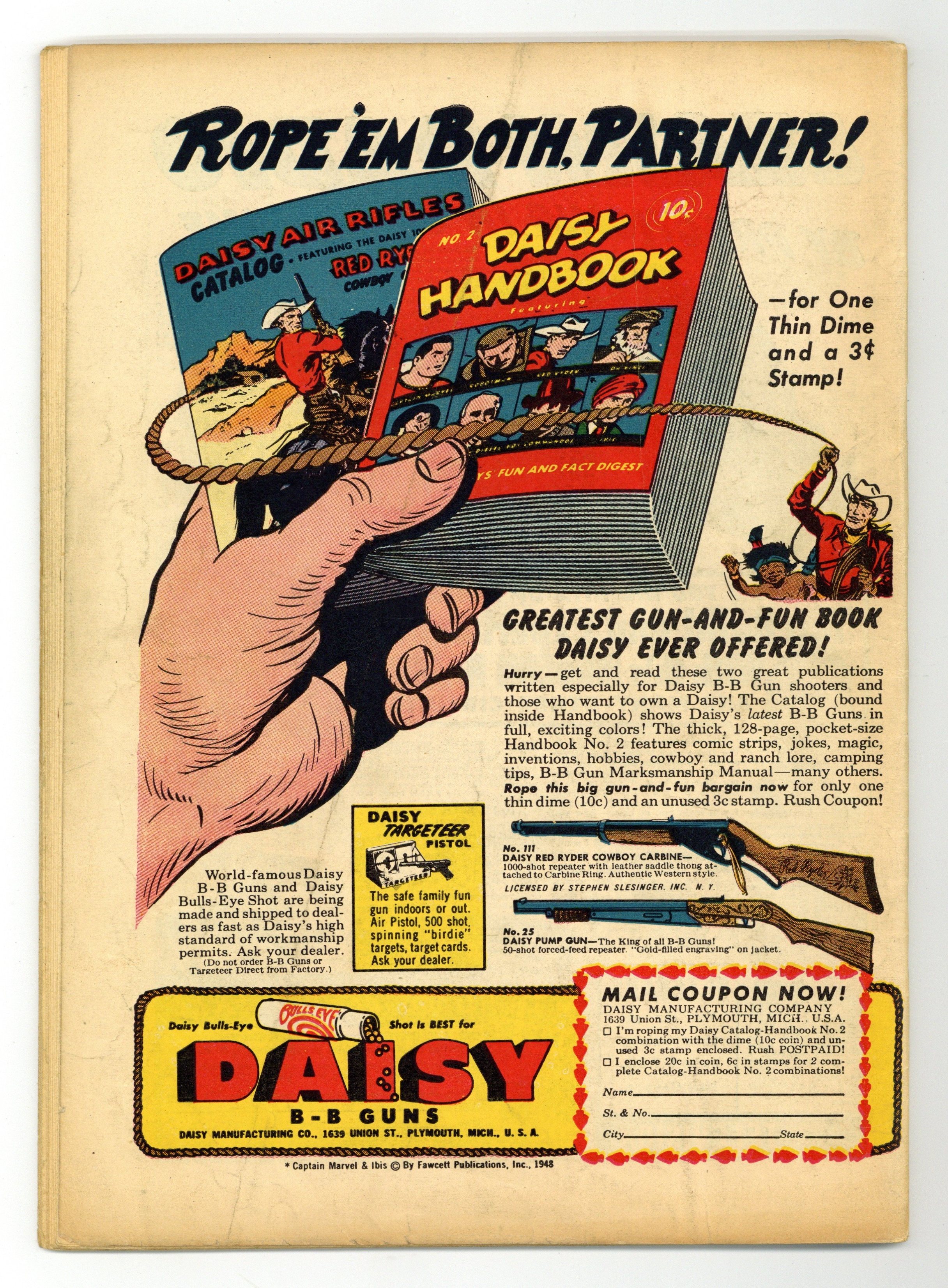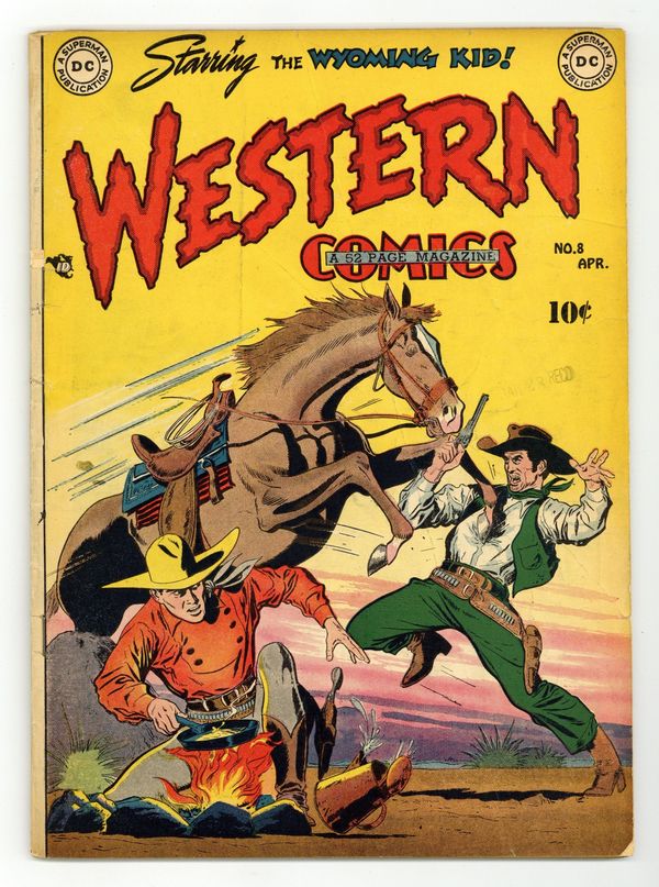 Cover art by John Lehti. The Origin of the Wyoming Kid, art by Howard Sherman. Ads for All-American Western #107 and Dale Evans Comics #4, pencils by Alex Toth, inks by Joe Giella. The Battle of Liberty Hill starring Rodeo Rick, script by Phil Evans, art by Jimmy Thompson. A short history of young BIlly Smith's work in the rodeo. A short history of the life of Buffalo Jones. Wagon-Wheel War starring Nighthawk, art by Charles Paris. Highlights of the careers of some rodeo cowgirls. From War-Whoop to Wigwag, art by Raymond Perry. The Phantom of Gunsmoke Mesa starring Cowboy Marshal, script by Phil Evans, art by Ed Smalle Jr. Ad for Scribbly #5, art by Sheldon Mayer. 52 pgs. $0.10. Cover price $0.10.