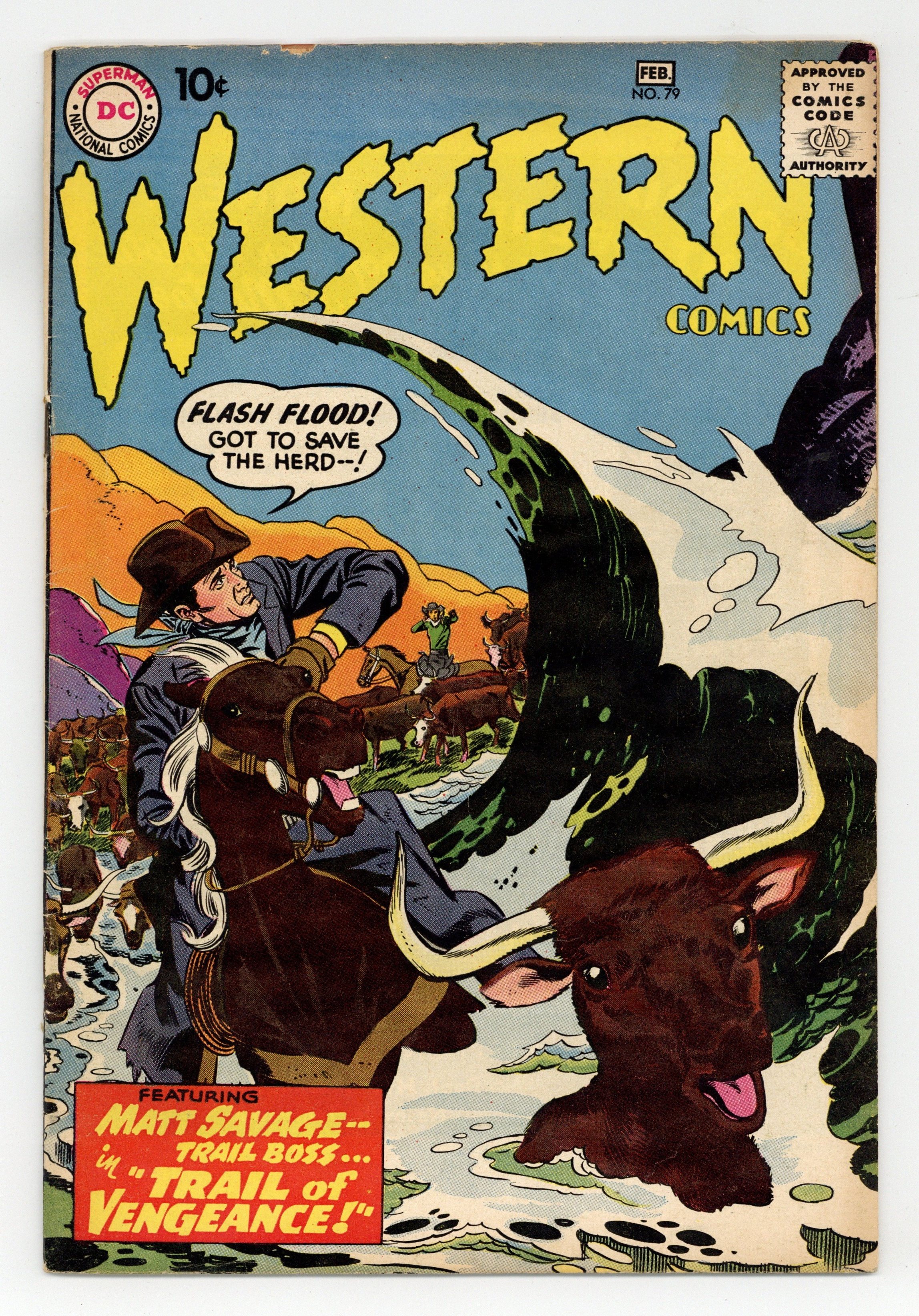 Cover pencils by Gil Kane, inks by Joe Giella. Trail of Vengeance starring Matt Savage, Trail Boss, script by Gardner Fox, pencils by Gil Kane, inks by Joe Giella. The Buffalo Hide Bandits starring Pow Wow Smith, script by Gardner Fox, art by Carmine Infantino. The Riddle of the Gold Watch starring the Wyoming Kid, script by Gardner Fox, art by Howard Sherman. 36 pgs. $0.10. Cover price $0.10.