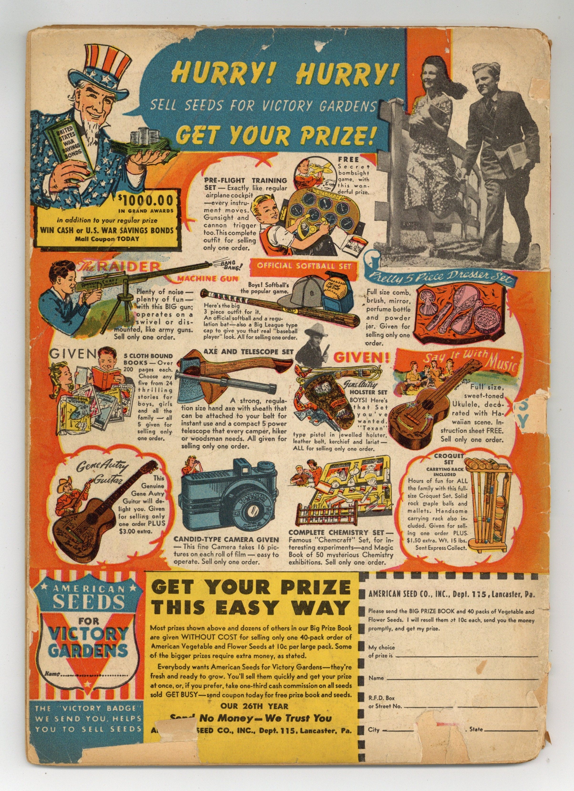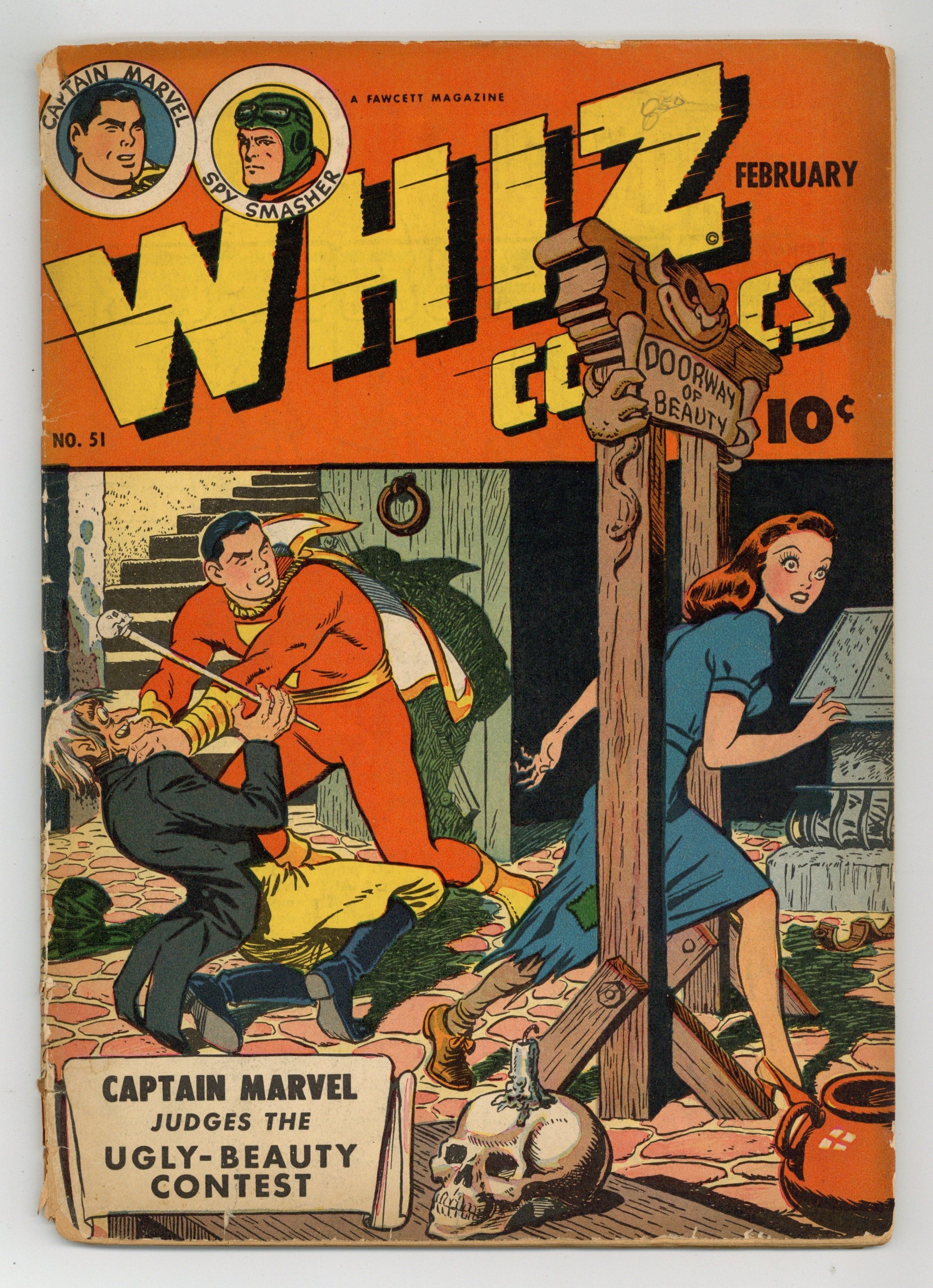 Cover by C. C. Beck. Stories and art by C. C. Beck, Al Carreno, and Alex Blum. The Fawcett comic that introduced the original Captain Marvel (Shazam) to the world. Captain Marvel is chosen to judge a beauty contest, but one of the contestants is the daughter of a wizard, who threatens an ugliness curse if she loses. Lance O'Casey and Mike investigate a supposed sea serpent, and find a secret Axis super-weapon. A hobo is transformed by Ibis's magical Ibistick into a second Ibis. Captain Marvel: The Beauty Contest; Golden Arrow: The Iron Horse; Spy Smasher: Mystery of Spy Island; Lance O'Casey: The Deadly Seadragon; Wicky and O'Shawnessy; Ibis the Invincible: Bobo the Hobo. 56 pages, Full Color. Cover price $0.10.