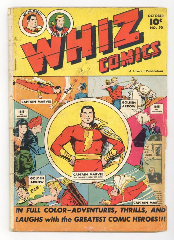 Stories and art by Basil Wolverton, Otto Binder, Irvin Steinberg, Kurt Schaffenberger and Bill Woolfolk. The Fawcett comic that introduced the original Captain Marvel (Shazam) to the world. The final exam at a school for evil sorcerers means nothing but trouble for Ibis and Taia, in a story with art by Superman artist Kurt Schaffenberger. Outlaws conceive of an innovative new getaway to escape Golden Arrow: a hot-air balloon. Plus a "Culture Corner" strip by legendary cartoonist Basil Wolverton, featuring useless but hilarious advice on "How to Save Your Sox." Captain Marvel: The Mail Girl; Doc Sorebones; The Culture Corner; Golden Arrow: The Balloon Robbers; Wicky and O'Shawnessy; Ibis the Invincible: School for Sorcerers. 32 pages, Full Color. Cover price $0.10.