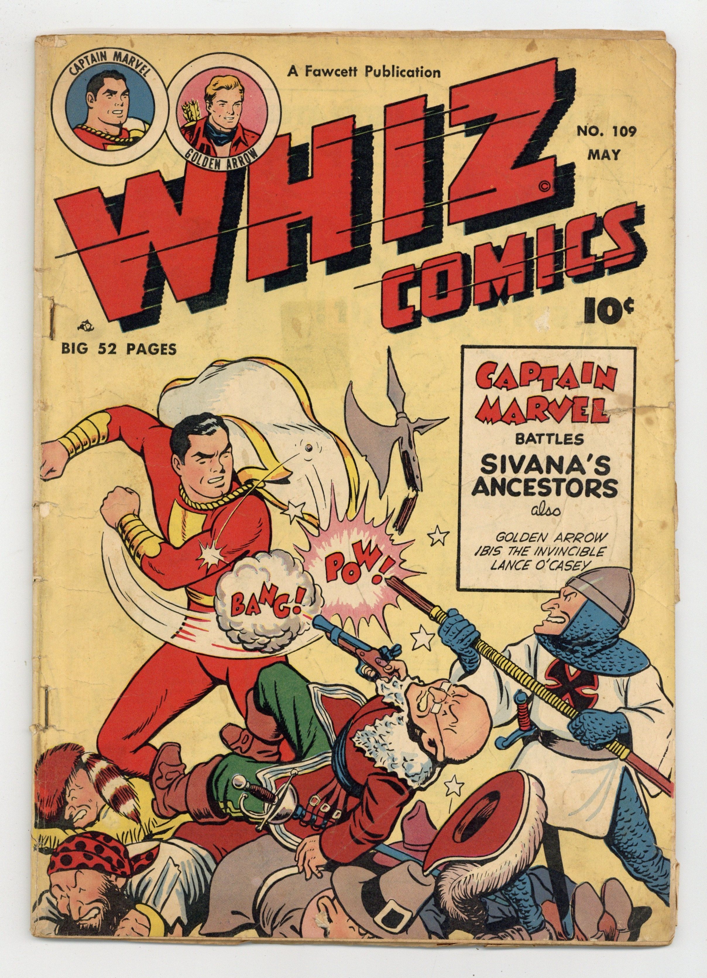 Cover by C.C. Beck. Stories and art by Basil Wolverton, Otto Binder, Frank Little, Frank Bolle, Kurt Schaffenberger and Bill Woolfolk. The Fawcett comic that introduced the original Captain Marvel (Shazam) to the world. Dr. Sivana's latest invention, the Ghost Machine, brings all his evil ancestors to plague Captain Marvel, in a story with art by Superman artist Kurt Schaffenberger. Ibis and Taia seek explorers lost in a desert, and stumble on the entrance to the Underworld, complete with Cerberus the three-headed dog. Plus a "Culture Corner" strip by legendary cartoonist Basil Wolverton, featuring useless but hilarious advice on "How to Keep a Chill From Your Bill." Captain Marvel: Sivana's Family Tree; Doc Sorebones; Wilbur the Waiter; The Culture Corner; Golden Arrow: Flaming Destruction; Wicky and O'Shawnessy; Lance O'Casey: The Pirate's Festival!; Nick and Dick; Freshman Freddy: The Patient Patient; Ibis the Invincible: The Land of the Lost. 48 pages, Full Color. Cover price $0.10.