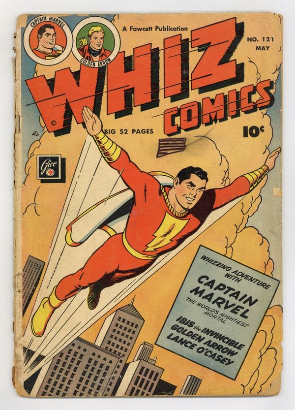 Cover by Kurt Schaffenberger. Stories and art by Basil Wolverton, Clem Weisbecker, and Kurt Schaffenberger. The Fawcett comic that introduced the original Captain Marvel (Shazam) to the world. Inventor Ezra Steele creates a metal alloy so light, it can be used to build gigantic structures that are almost weightless - but he forgets to anchor them in case of strong wind. Lance O'Casey discovers that gangsters are using strong-arm tactics to get boxer Bellew to throw a fight, but the thing about boxers is, they can take a punch. Plus a "Culture Corner" strip by legendary cartoonist Basil Wolverton, featuring useless but hilarious advice on "How to Eat in a Theater Seat." And a vintage ad for The Captain Marvel Club. Captain Marvel: The Wonder Alloy; Wilbur the Waiter; Freshman Freddy: The Show Must Go On; The Culture Corner; Golden Arrow: The Bank Deal; Wicky and O'Shawnessy; Lance O'Casey: Frame Up; Spud and Jud; Colonel Corn and Korny Kobb; Ibis the Invincible: Death Song of the Sirens. 48 pages, Full Color. Cover price $0.10.
