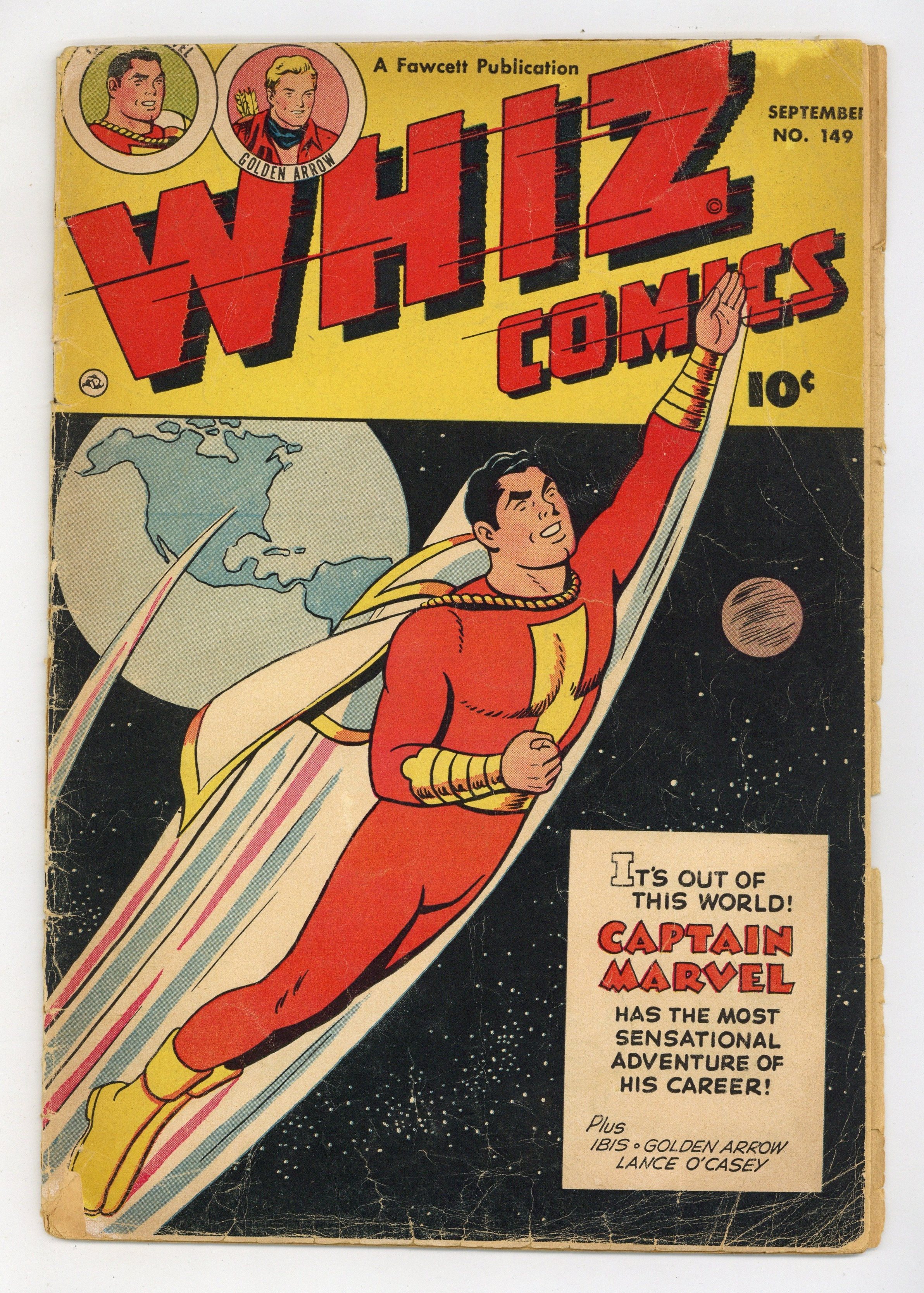 Cover by Pete Costanza. Stories and art by Bill Woolfolk and Kurt Schaffenberger. The Fawcett comic that introduced the original Captain Marvel (Shazam) to the world. Captain Marvel decides to see what one superhuman can do against world hunger. Escapees from "Elcatriz Prison" board the Starfish, causing a fire, and forcing Lance to board the dangerous burning ship to save Mike. Golden Arrow has the chance to expose the greatest fraud the county has ever seen, but first he must start a cave-in in a mine with a single arrow shot. Captain Marvel Battles Hunger; Doc Sorebones; Lance O'Casey: Killers on the Loose; Golden Arrow: The Freight Fraud; Wicky and O'Shawnessy; What's the Name?; Wilbur the Waiter; Ibis the Invincible: The Magician in the Mirror. 32 pages, Full Color. Cover price $0.10.