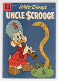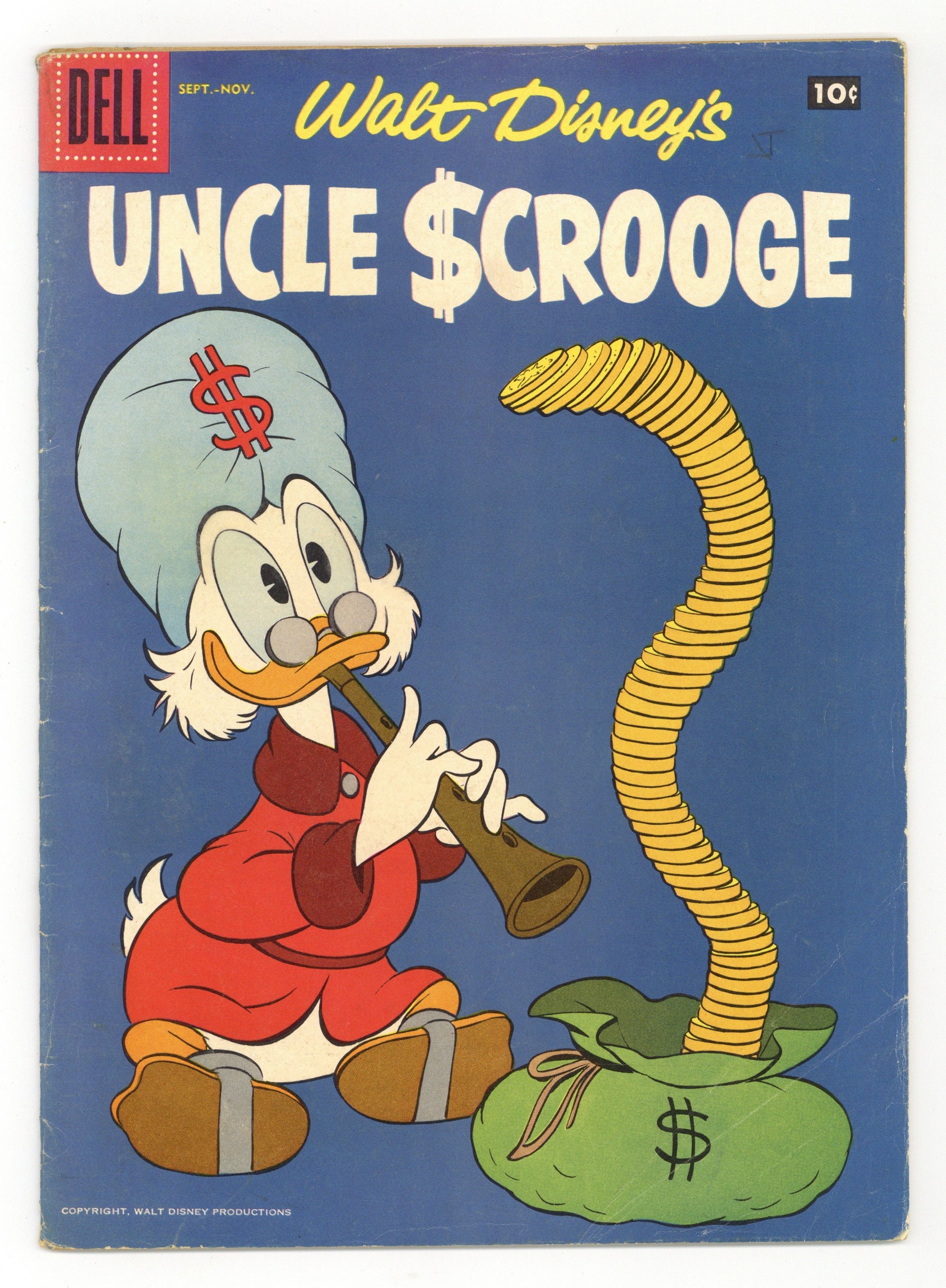 Tags: Disney Ducks & MicePublished Nov 1957 by Dell/Gold Key/Whitman.$8.0010¢ Edition. Cover by Carl Barks. Stories and art by Carl Barks and Tony Strobl. Comics legend Carl Barks creates his masterpiece, featuring the adventures of Donald Duck's Uncle Scrooge, the richest duck in the world. During a trip around the world, Scrooge stumbles on the Mines of King Solomon, but his nephews' Junior Woodchuck animal calls draw unwelcome attention. Gyro Gearloose is hired to build a house that's as soft as pillows. Scrooge, like George Washington, hurls a dollar across the Potomac River, but then he races in a boat across the river to catch the dollar on the other side. History Tossed; Uncle Scrooge: The Mines of King Solomon; Gyro Gearloose: Gyro Builds a Better House; Birthday Busy-ness. 32 pages, Full Color. Cover price $0.10.