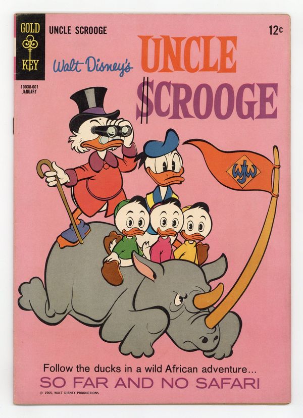 Cover by Carl Barks. Stories and art by Carl Barks, Vic Lockman, Bob Karp, Al Taliaferro, Phil De Lara, Larry Mayer and Tony Strobl. Comics legend Carl Barks creates his masterpiece, featuring the adventures of Donald Duck's Uncle Scrooge, the richest duck in the world. Scrooge, Donald, and his nephews race to Africa to bid on a gold mine, but his old foe Flintheart Glomgold will stop at nothing to claim it for himself. Gyro's robot walking stick runs away. An office boy accepts Scrooge's offer of "top wages," but he should have asked what that meant. So Far No Safari; Gyro Gearloose: The Runaway Walking Stick; The Big Dinner Plot; Top Wages. 32 pages, Full Color. Cover price $0.12.
