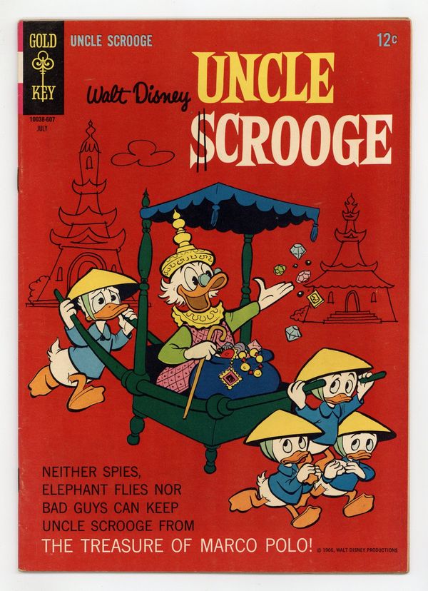 Cover by Carl Barks. Stories and art by Carl Barks, Vic Lockman, Phil De Lara, Tony Strobl, Steve Steere, Bob Karp, and Al Taliaferro. Comics legend Carl Barks creates his masterpiece, featuring the adventures of Donald Duck's Uncle Scrooge, the richest duck in the world. A note left by Marco Polo leads Scrooge, Donald, and his nephews to the dangerous nation of Unsteadystan to search for lost treasure. Gyro Gearloose builds a robot helper for his robot, Helper. When Scrooge buys an ice cream parlor, Huey, Dewey and Louie are going to eat as much ice cream as they can, whether they want to or not. Treasure of Marco Polo; Not an Astronaut; Gyro Gearloose: The Helper's Helper; Paying the Rent. 32 pages, Full Color. Cover price $0.12.