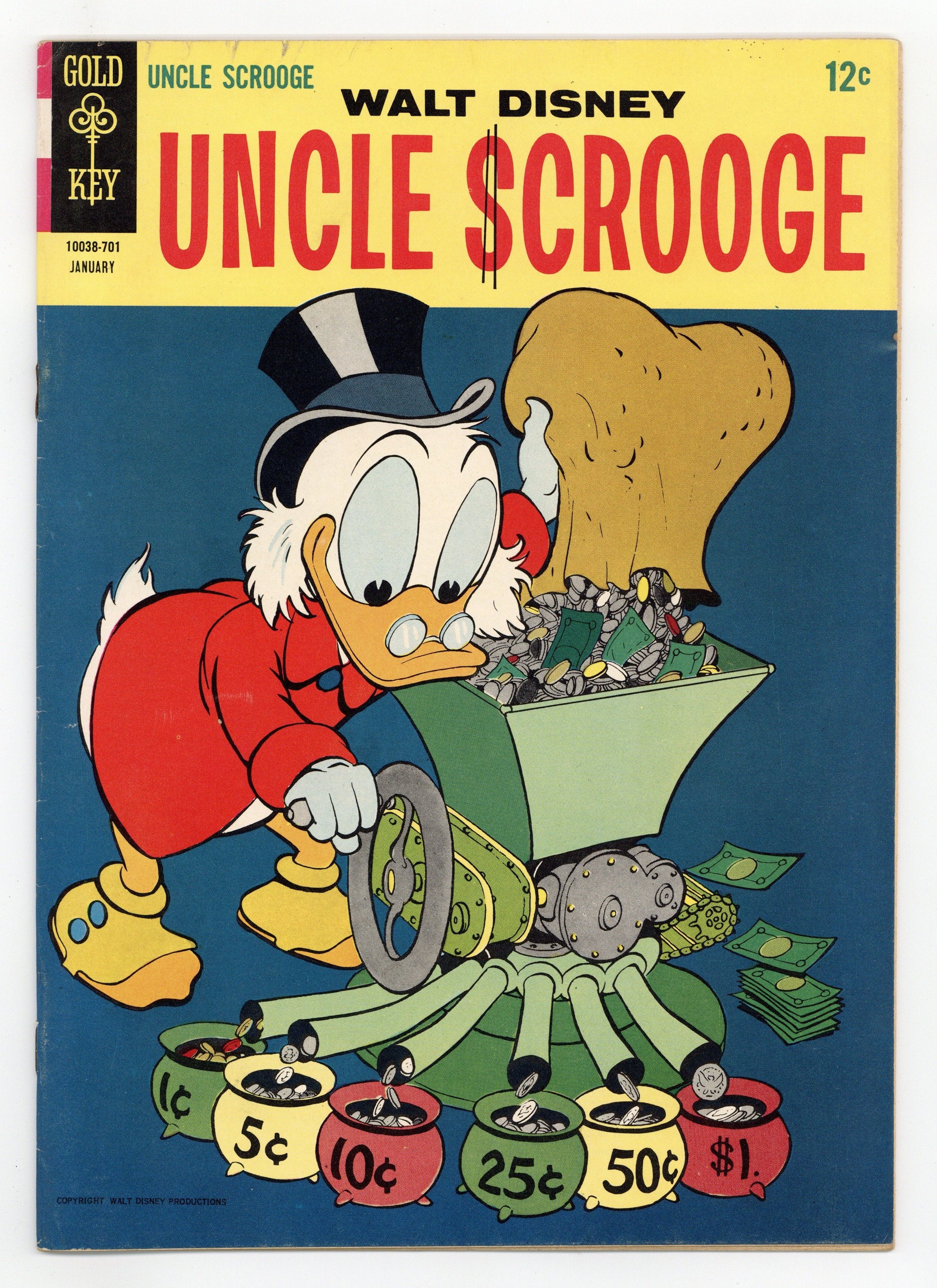 Cover by Carl Barks. Stories and art by Carl Barks, Vic Lockman, Phil De Lara, Tony Strobl, Steve Steere, Paul Murry, John Liggera, Bob Karp, and Al Taliaferro. Comics legend Carl Barks creates his masterpiece, featuring the adventures of Donald Duck's Uncle Scrooge, the richest duck in the world. When Scrooge learns of the philosopher's stone, which can turn other metals into gold, he launches a search across Europe that leads to the labyrinth of Crete. A strange chemical concoction gives Gyro superpowers. Uncle Scrooge arranges the street more to his liking. The Fabulous Philosophers Stone; Golden Dollar Street; One in a Million; Well Belted; Gyro Gearloose: Super Scientist. 32 pages, Full Color. Cover price $0.12.