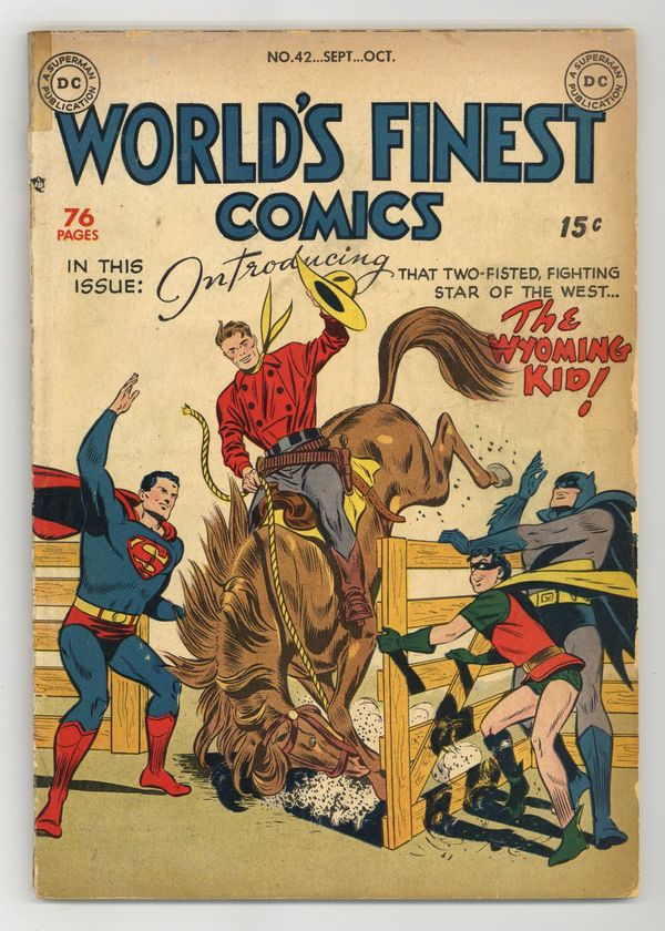 Cover art by Wayne Boring (Superman), Win Mortimer (Batman & Robin), and Howard Sherman (Wyoming Kid). The Alphabetical Animal Adventure starring Superman, art by Al Plastino; Aliens from Uranus come to Earth in flying saucers to collect two of every kind of animal, including humans. Little Pete humor page by Henry Boltinoff. The Unknown Adventure, script by Otto Binder, art by George Papp; Green Arrow goes to Mars! The Knights of the Square Table starring Doc & Fatty, art by Howard Sherman. On the Vengeance Trail starring the Wyoming Kid, script by Ryerson Johnson, art by Howard Sherman. The Sun-Born Mountain Man bio on Gantry Daniels, art by Bruno Premiani. The Varmint and the Wizard starring Zatara, art by Joe Kubert. Cowhide In the Clouds text article. Smokey the Bear Comes to The Rescue public service announcement with Peter Porkchops, script by Jack Schiff. The Amazing Adventure of Batman and Marco Polo starring Batman and Robin, script by Bill Finger, art by Jim Mooney; a time travel story. 76 Pages, Full Color. Cover price $0.15.