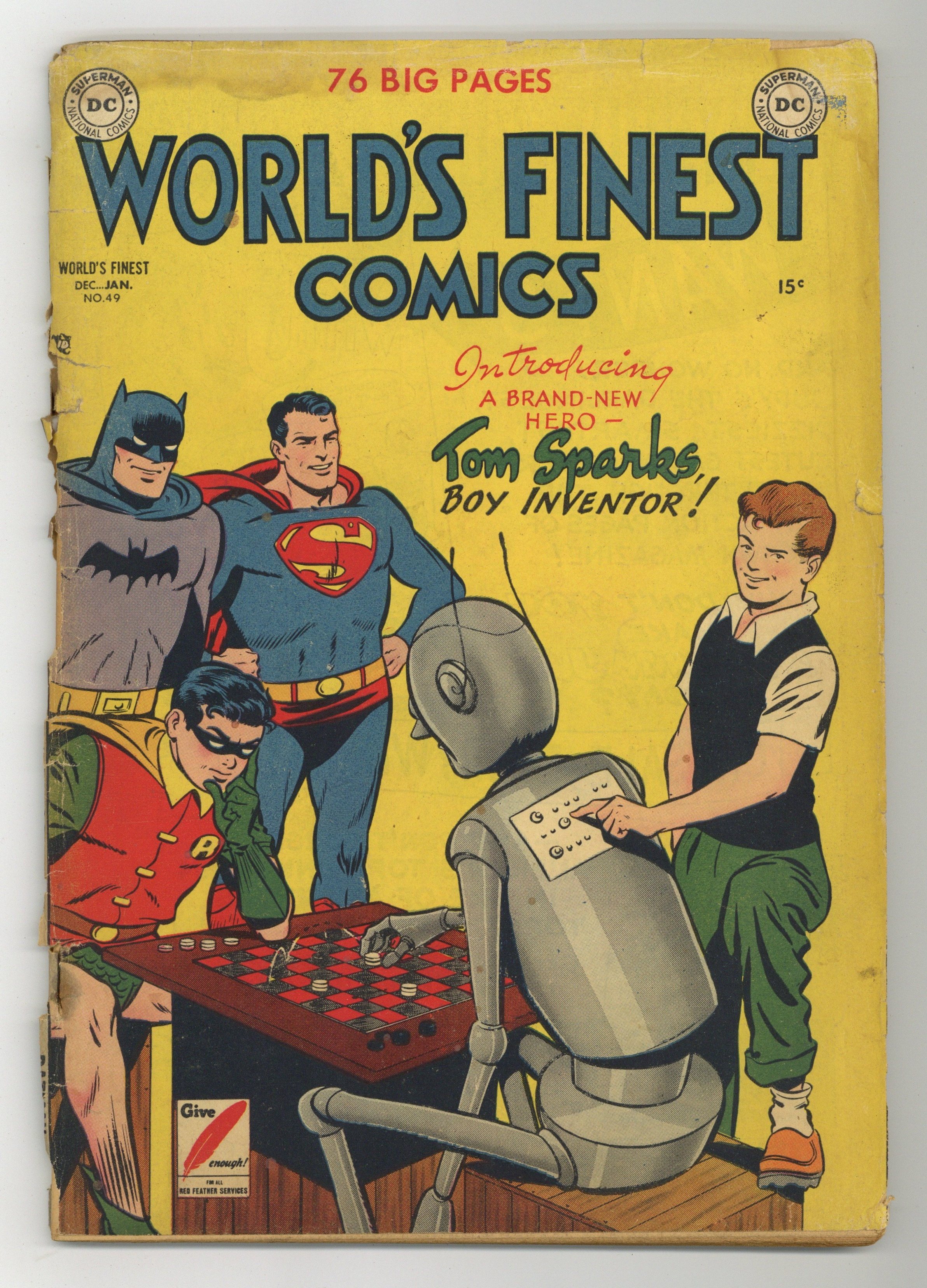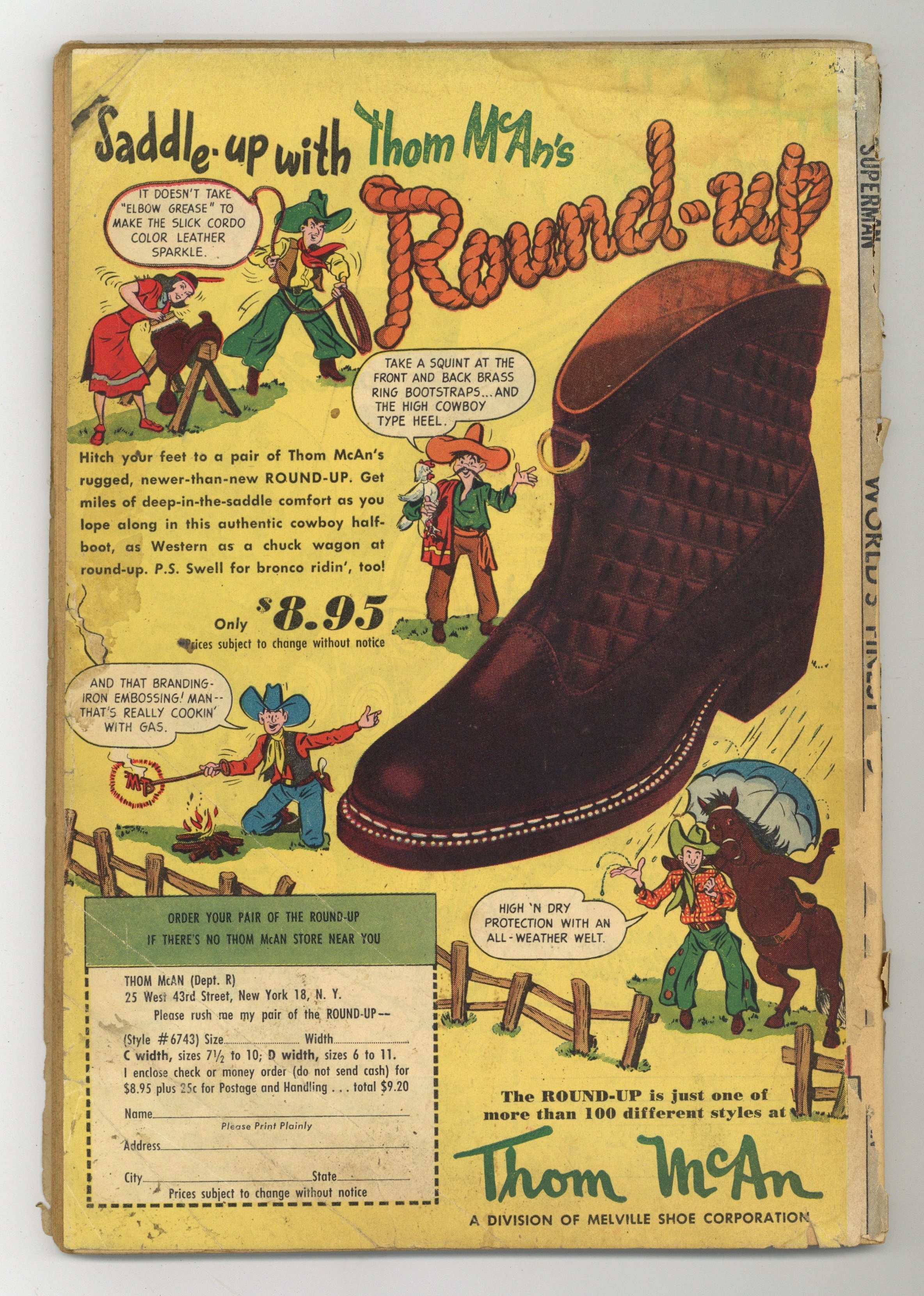 Cover pencils by Win Mortimer, inks by Stan Kaye. The Men Who Shot Superman starring Superman, Lois Lane, and Howard Figit, script by Alvin Schwartz, art by Al Plastino. Casey the Cop humor page by Henry Boltinoff. The City Without a Jail starring Green Arrow, script by George Kashdan, art by George Papp. Tom Sparks, Boy Inventor. Your United Nations At Work! public service announcement, script by Jack Schiff, art by Win Mortimer. The Town the Law Forgot starring Wyoming Kid, script by Ryerson Johnson, art by Howard Sherman. Shorty humor page by Henry Boltinoff. Terror on the Choo Choo Train starring Zatara, script by Joe Samachson, art by Ralph Mayo. Varsity Vic two-pager by Henry Boltinoff. Wrestling Through The Ages text article. White Feather For Batman starring Batman, Robin, and the Penguin, script by David Vern, art by Dick Sprang. 76 Pages, Full Color. Cover price $0.15.