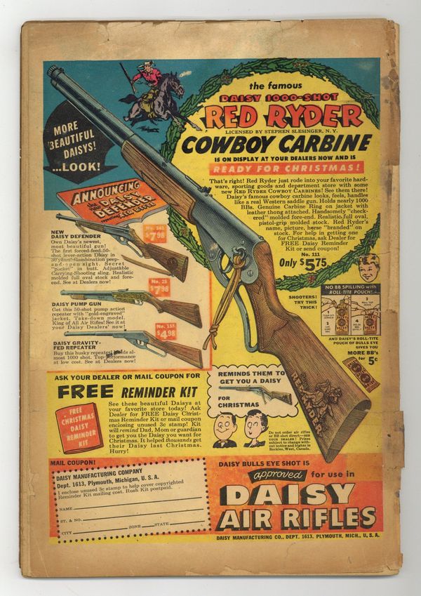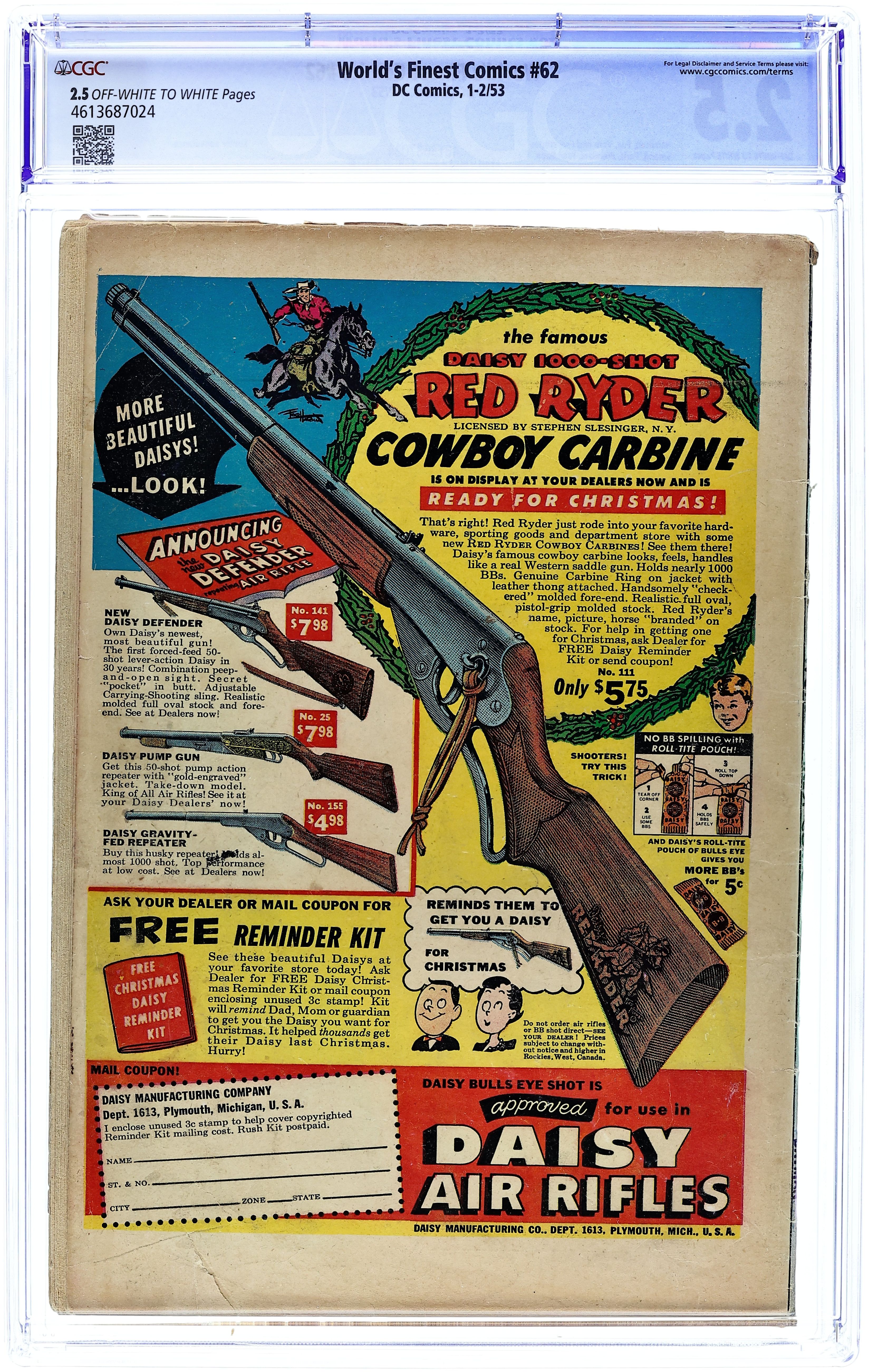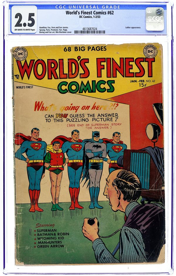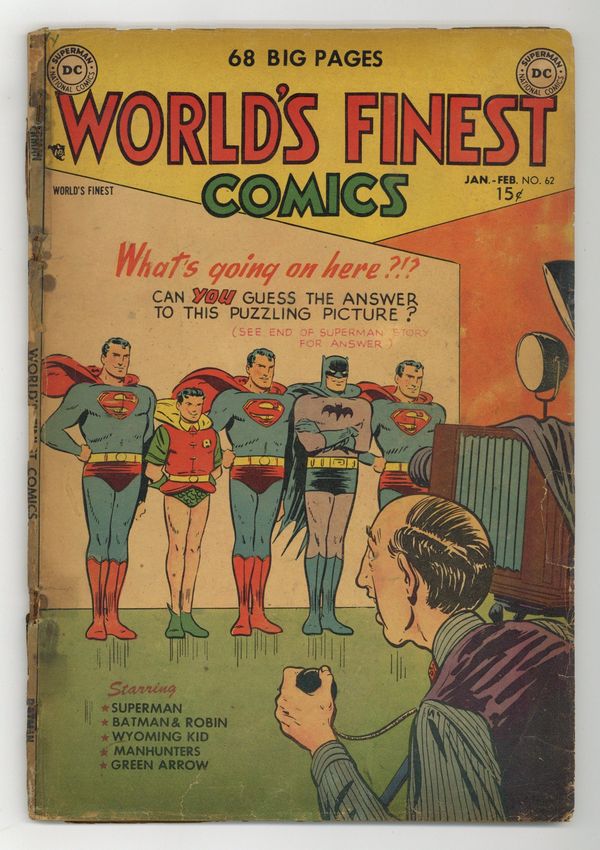 Cover art by Winslow Mortimer. The Seven Secrets of Superman starring Superman and Lex Luthor, script by Edmond Hamilton, pencils by Wayne Boring, inks by Stan Kaye. Free Speech -- Free for All! public service announcement starring Buzzy, script by Jack Schiff. The Black Magician starring Green Arrow, art by George Papp. A New Kind of Junior Sport public service announcement starring Superboy, script by Jack Schiff, art by Win Mortimer. Super Sleuth McFooey story, script and art by Jack Farr. The Gold Squad starring Manhunters Around the World, pencils by Curt Swan. Jerry The Jitterbug humor page by Henry Boltinoff. The Million Dollar Coin starring Wyoming Kid, script by Gardner Fox, art by Bruno Premiani. Hair on Their Faces text article by Dick Keene. Sir Batman and the Black Knight starring Batman, Commissioner Gordon, and the Black Rogue, script by David Vern, pencils by Dick Sprang, inks by Charles Paris. 68 Pages, Full Color. Cover price $0.15.