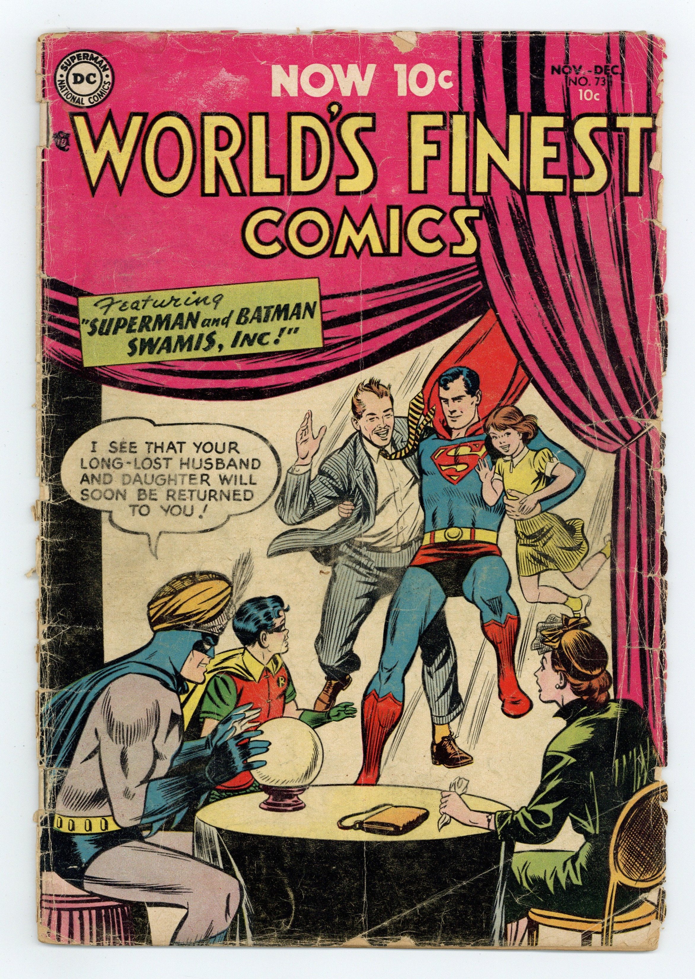 Cover pencils by Curt Swan, inks by Stan Kaye. Batman and Superman, Swamis Inc. starring Superman and Batman, script by Edmond Hamilton, pencils by Curt Swan, inks by Stan Kaye; Batman poses as a Swami in a circus to lure out a superstitious criminal, and Superman helps him by making his predictions come true. The Yankee Schoolmaster starring Tomahawk, pencils by Bruno Premiani. The Hercules Arrow starring Green Arrow, art by George Papp. 36 Pages, Full Color. Cover price $0.10.